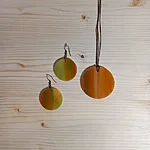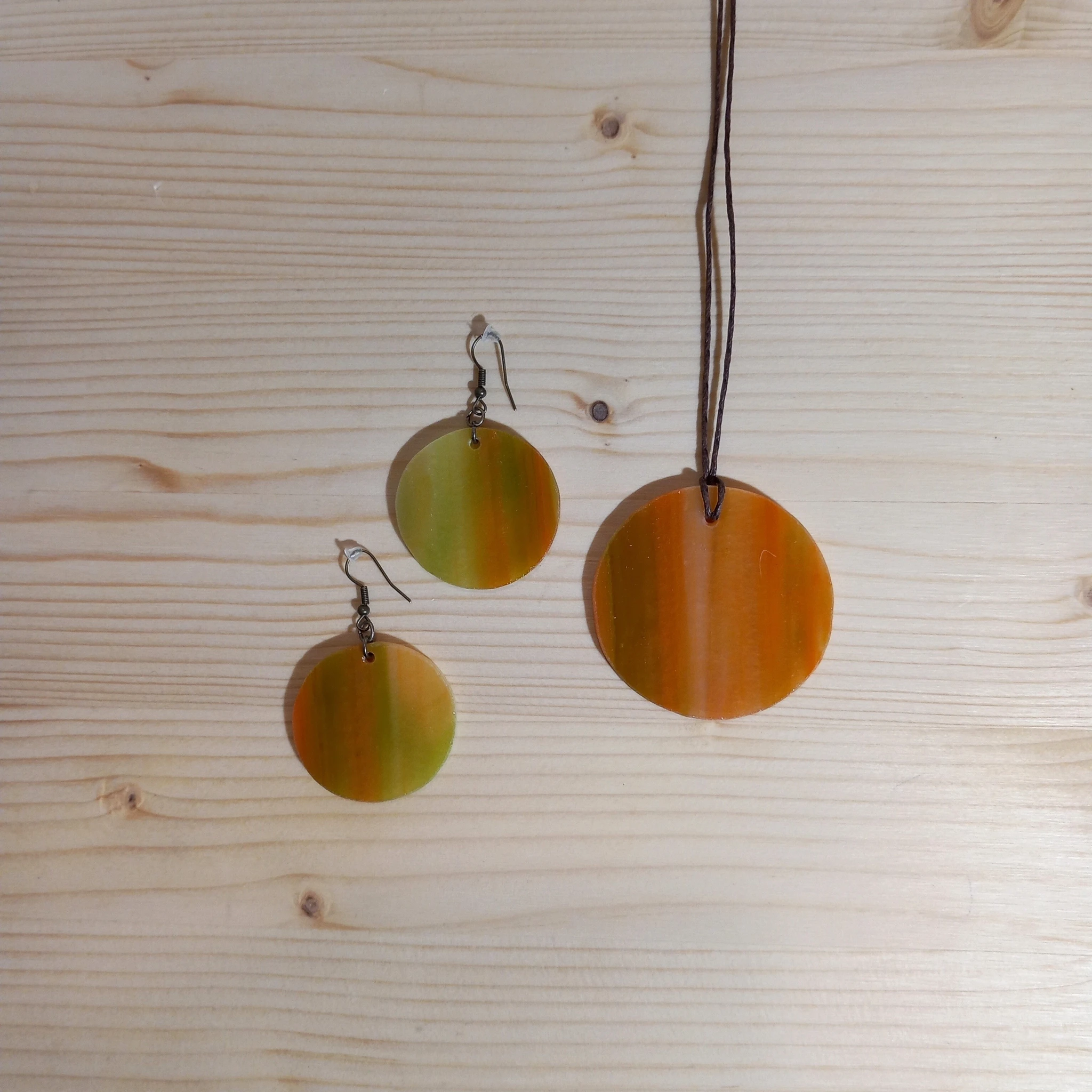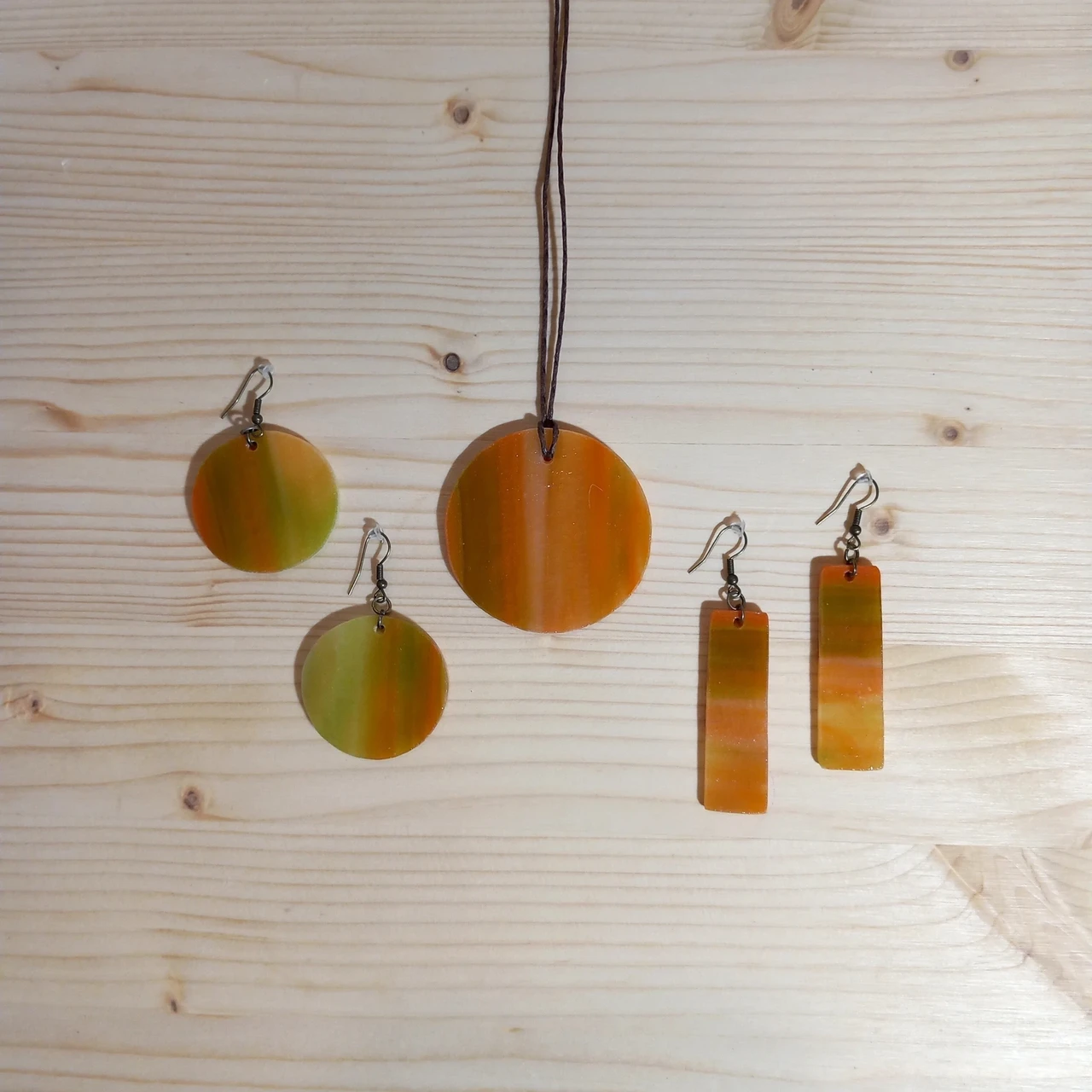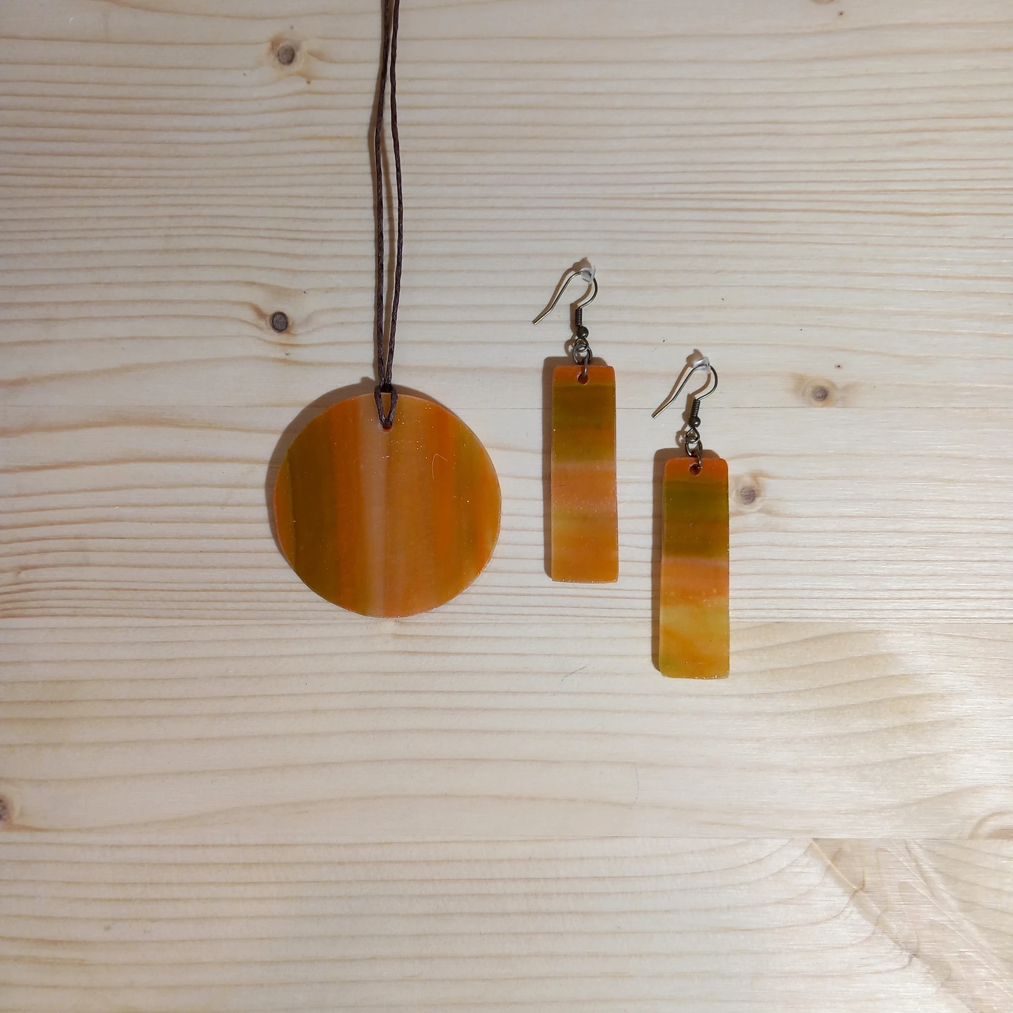 Komplektis on oranži- ja rohelisekirjust läbipaistmatust klaasist valmistatud kaelaehe ning ümmargused või ristkülikukujulised (valikuliselt 1 paar) kõrvarõngad.