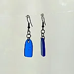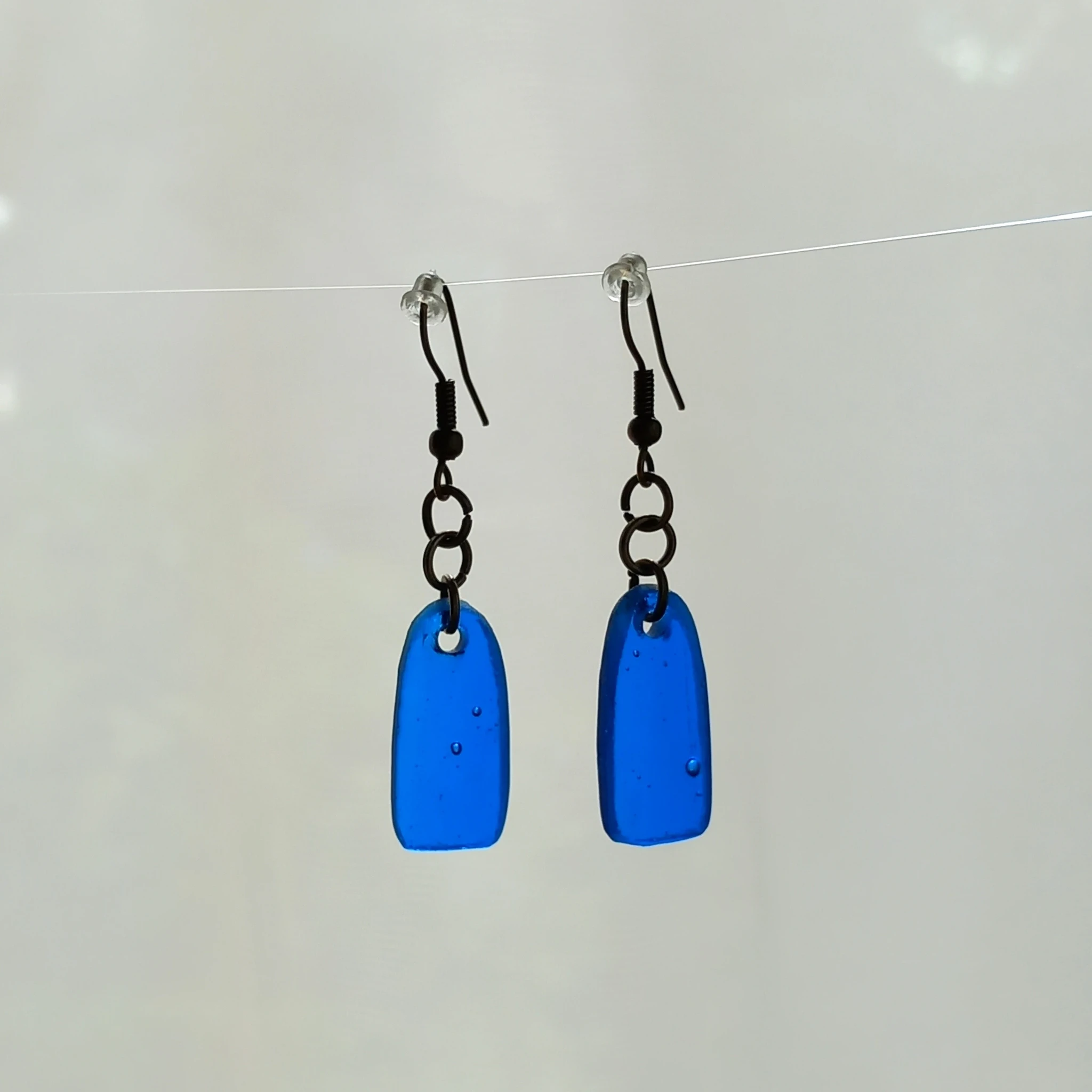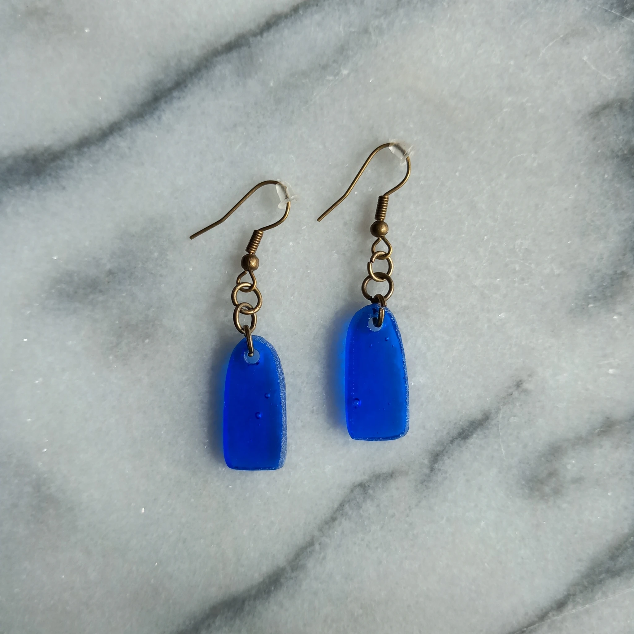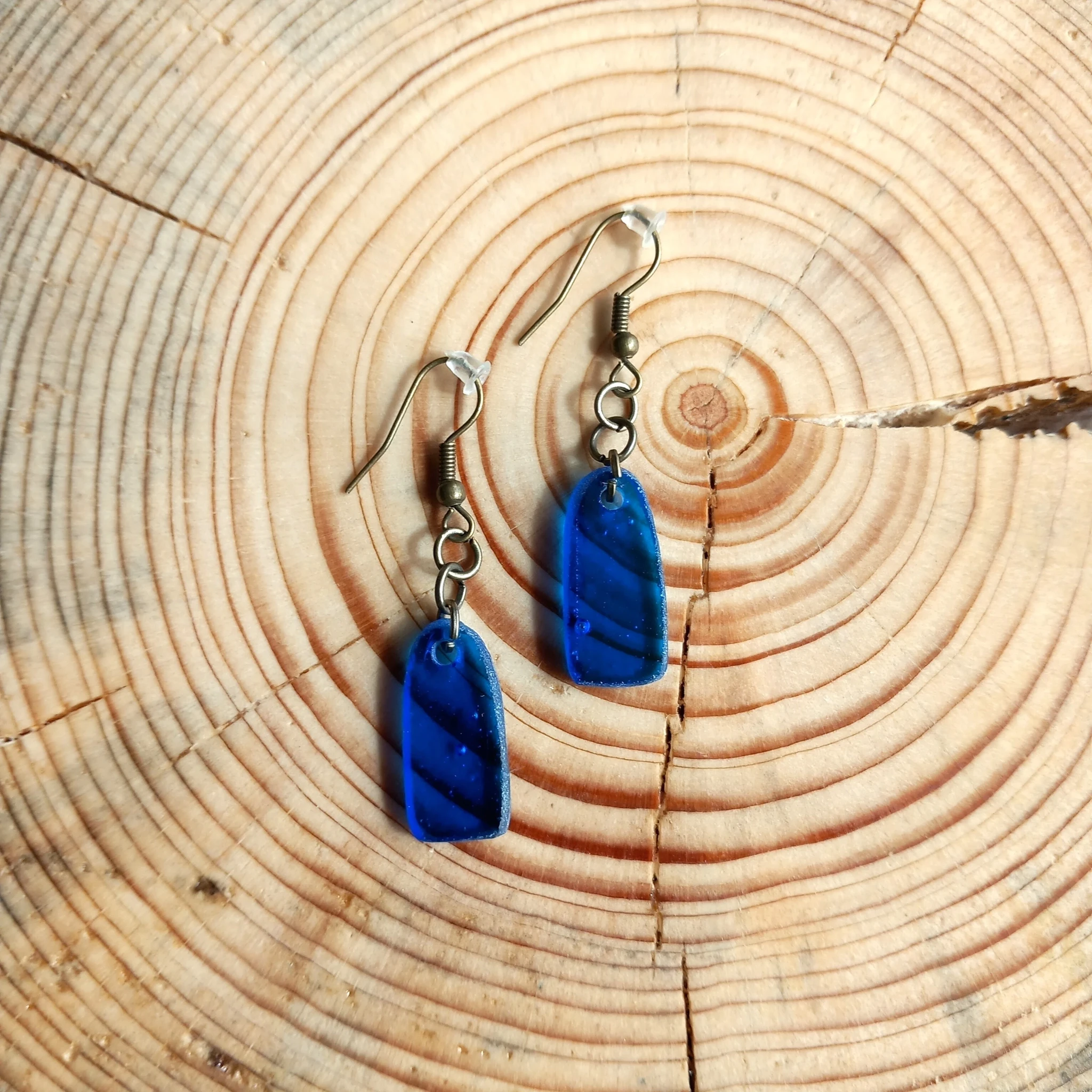 Sinisest klaasist kõrvarõngad vaskrõngaste ja vasekarva kõrvarõngakonksudega.