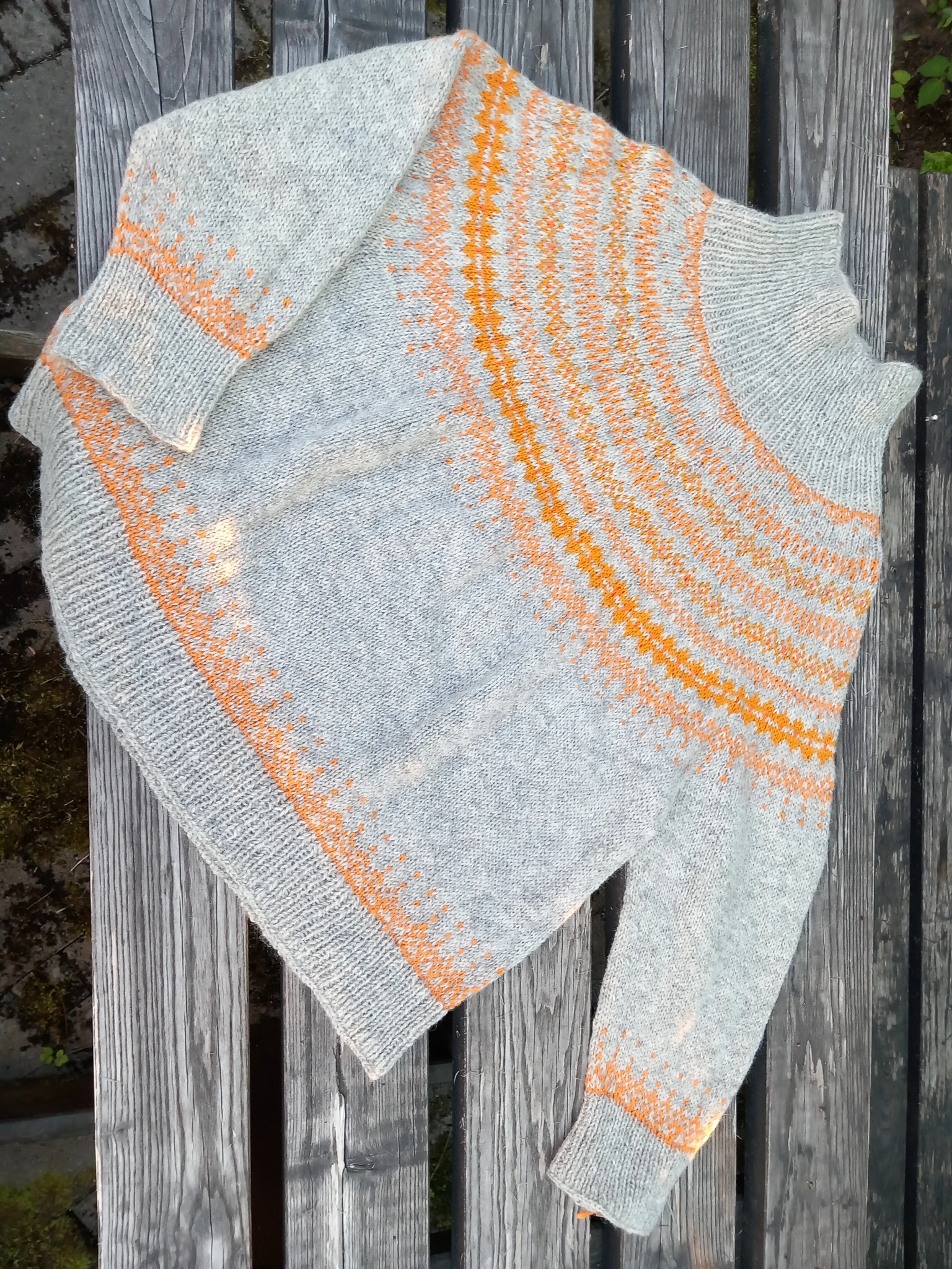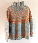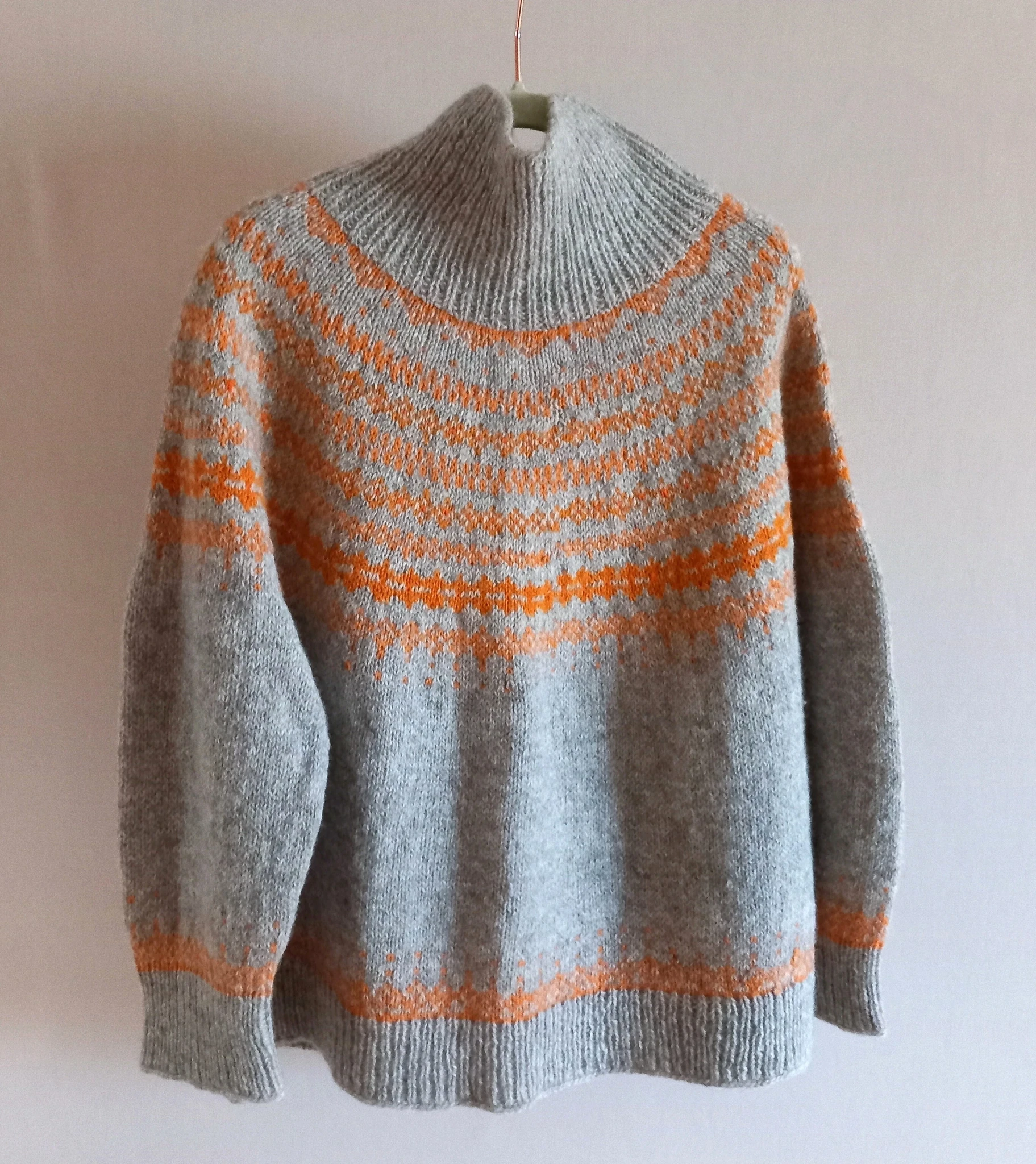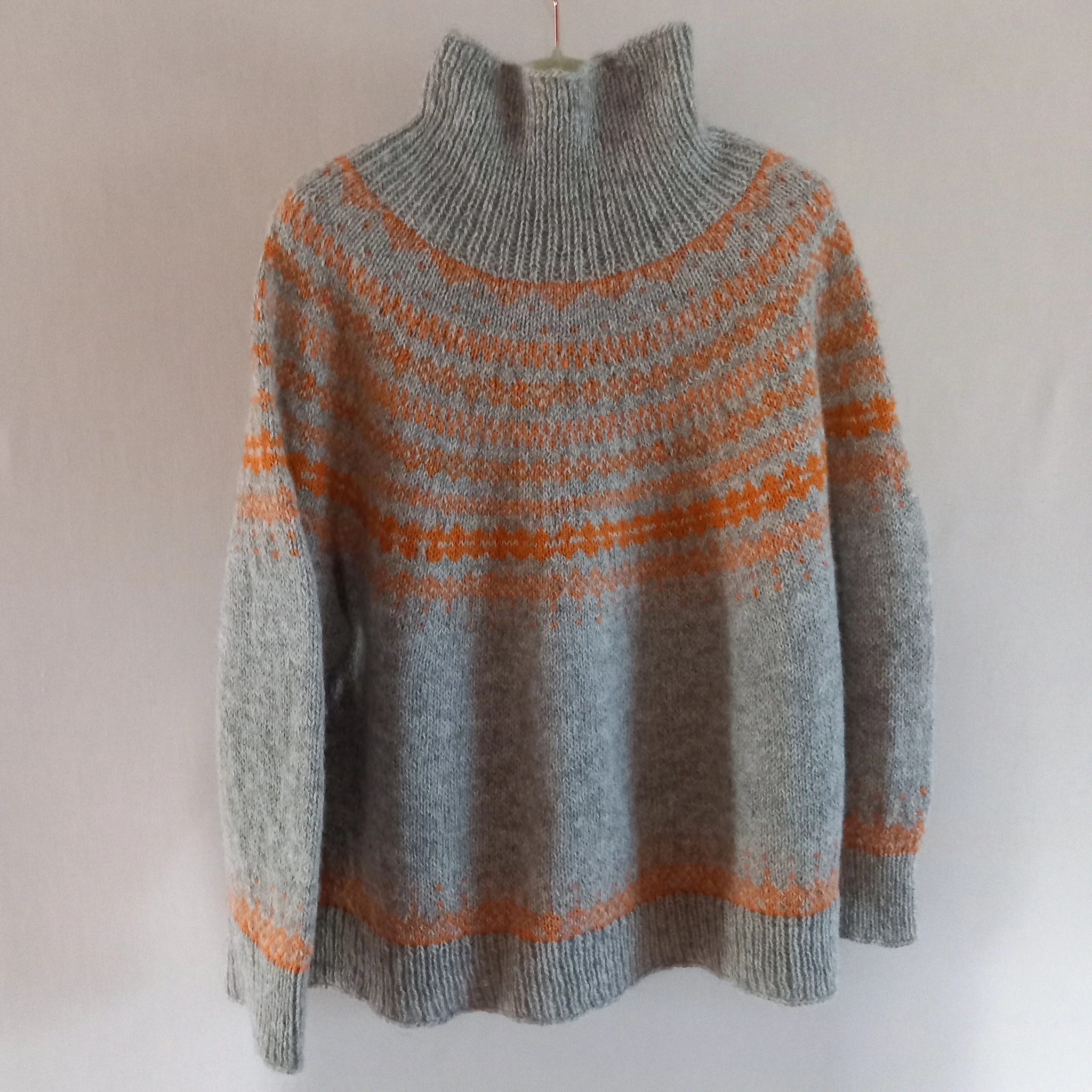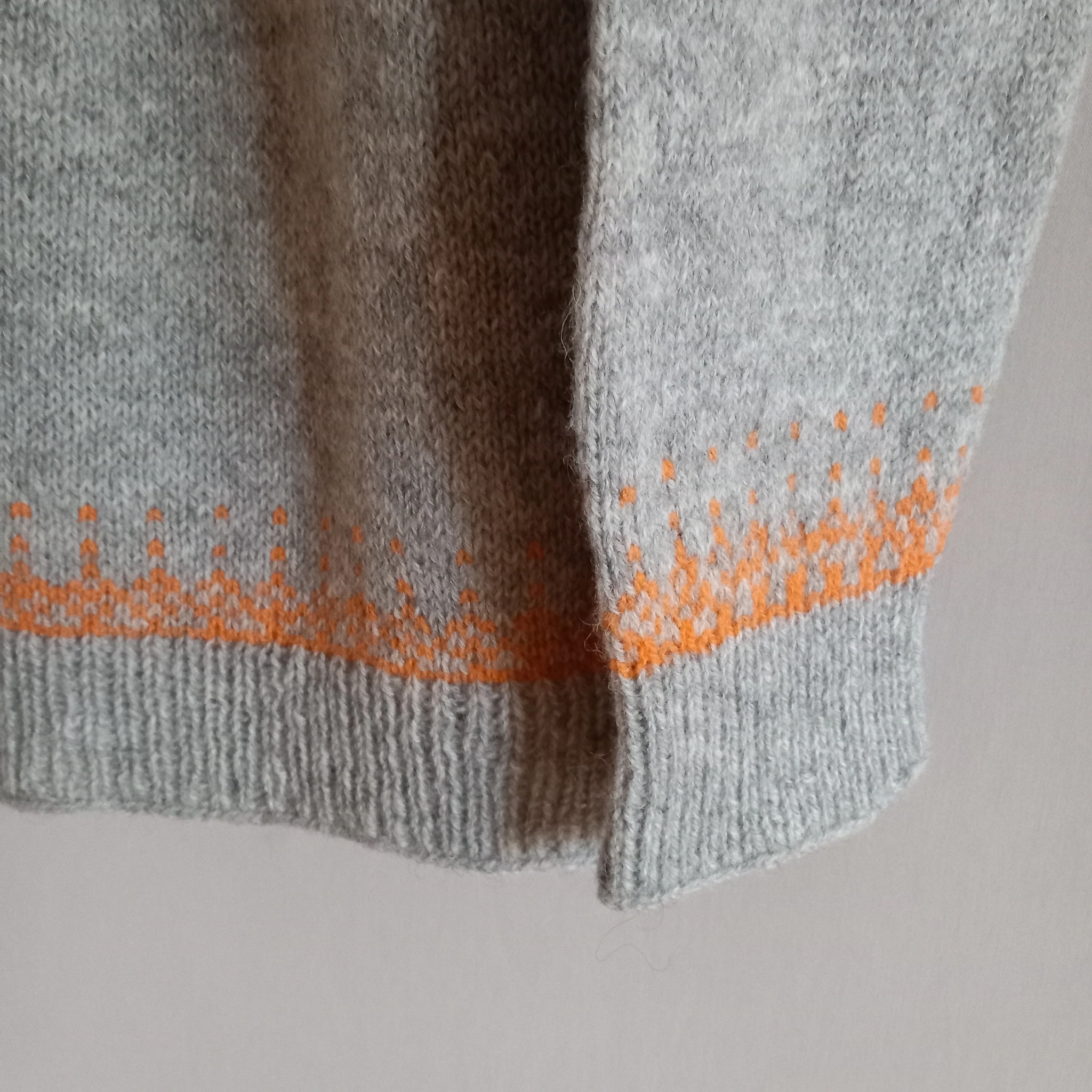 Helehall kampsun on kootud käsitsi (varrastel) kolmekordsest lambavillasest lõngast. Kampsunil on põhjamaade stiilis oranžides toonides mustriline passe ning poolkõrge kaelus.