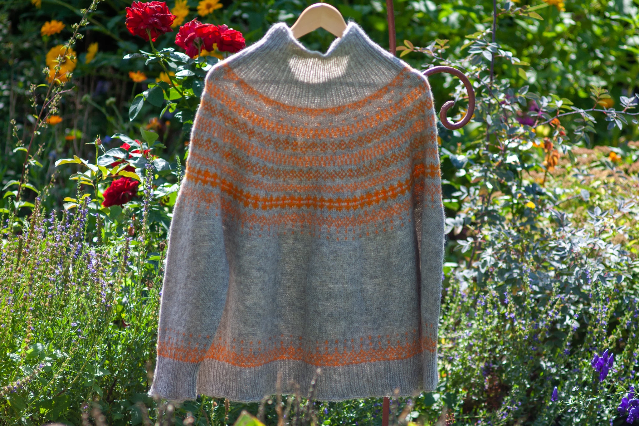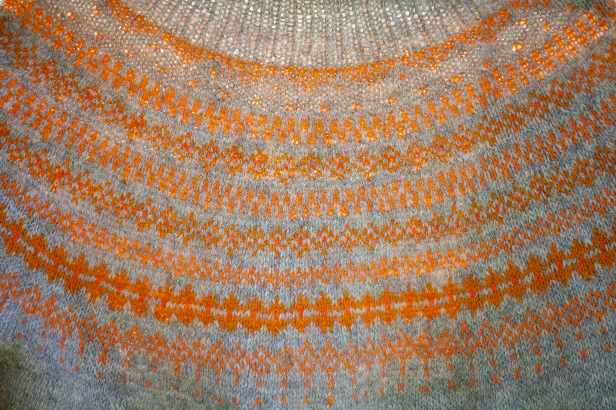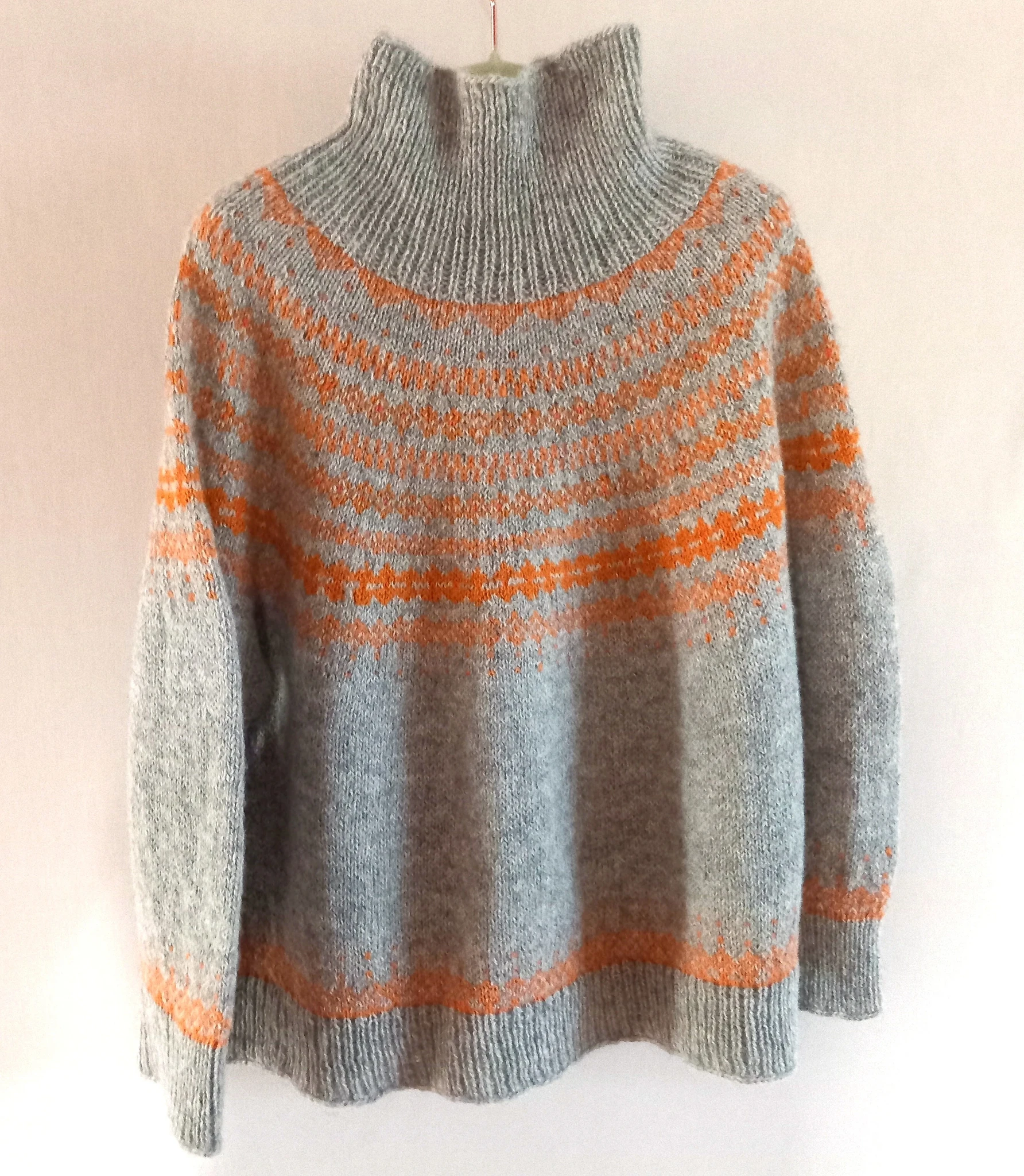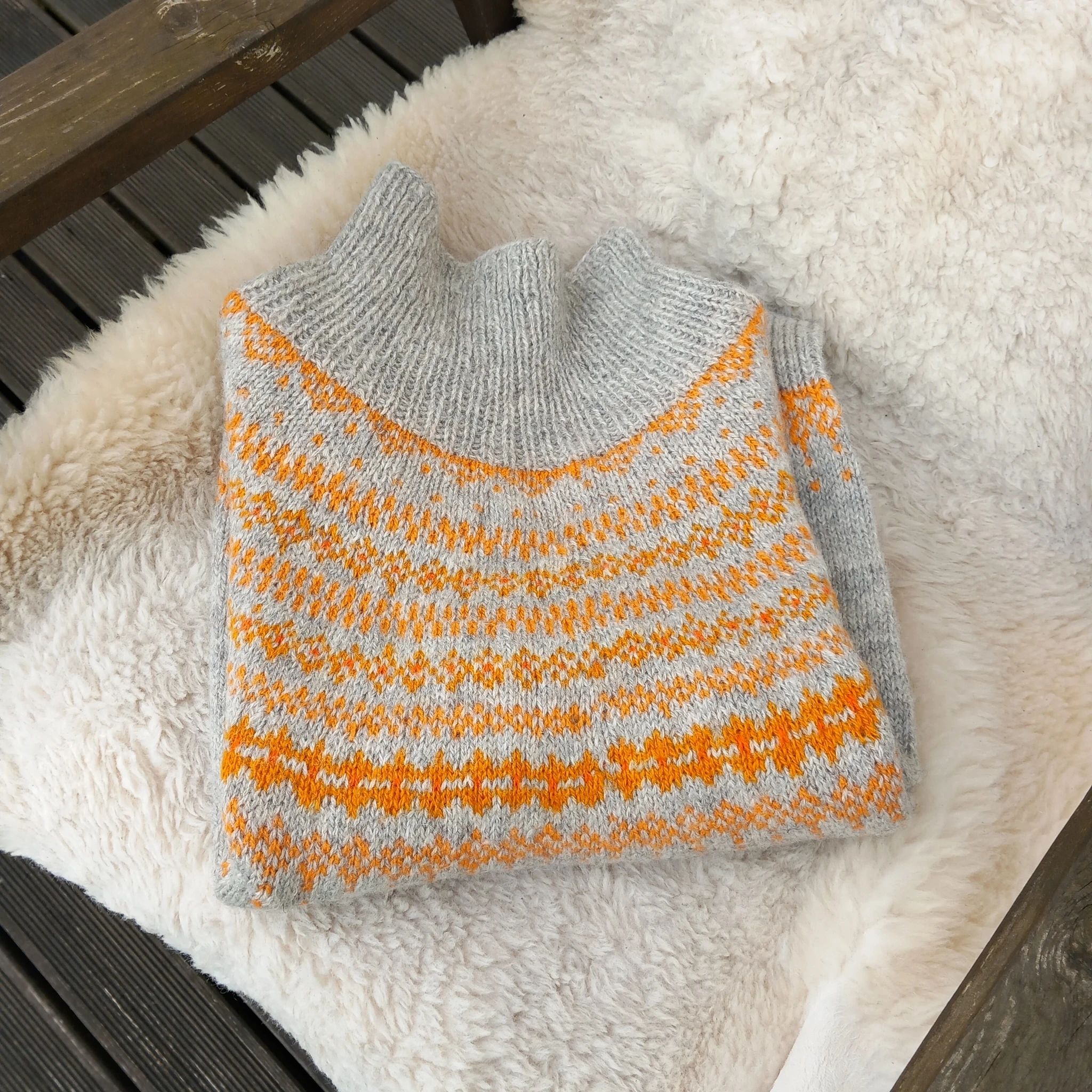 Helehall kampsun on kootud käsitsi (varrastel) kolmekordsest lambavillasest lõngast. Kampsunil on põhjamaade stiilis oranžides toonides mustriline passe ning poolkõrge kaelus.