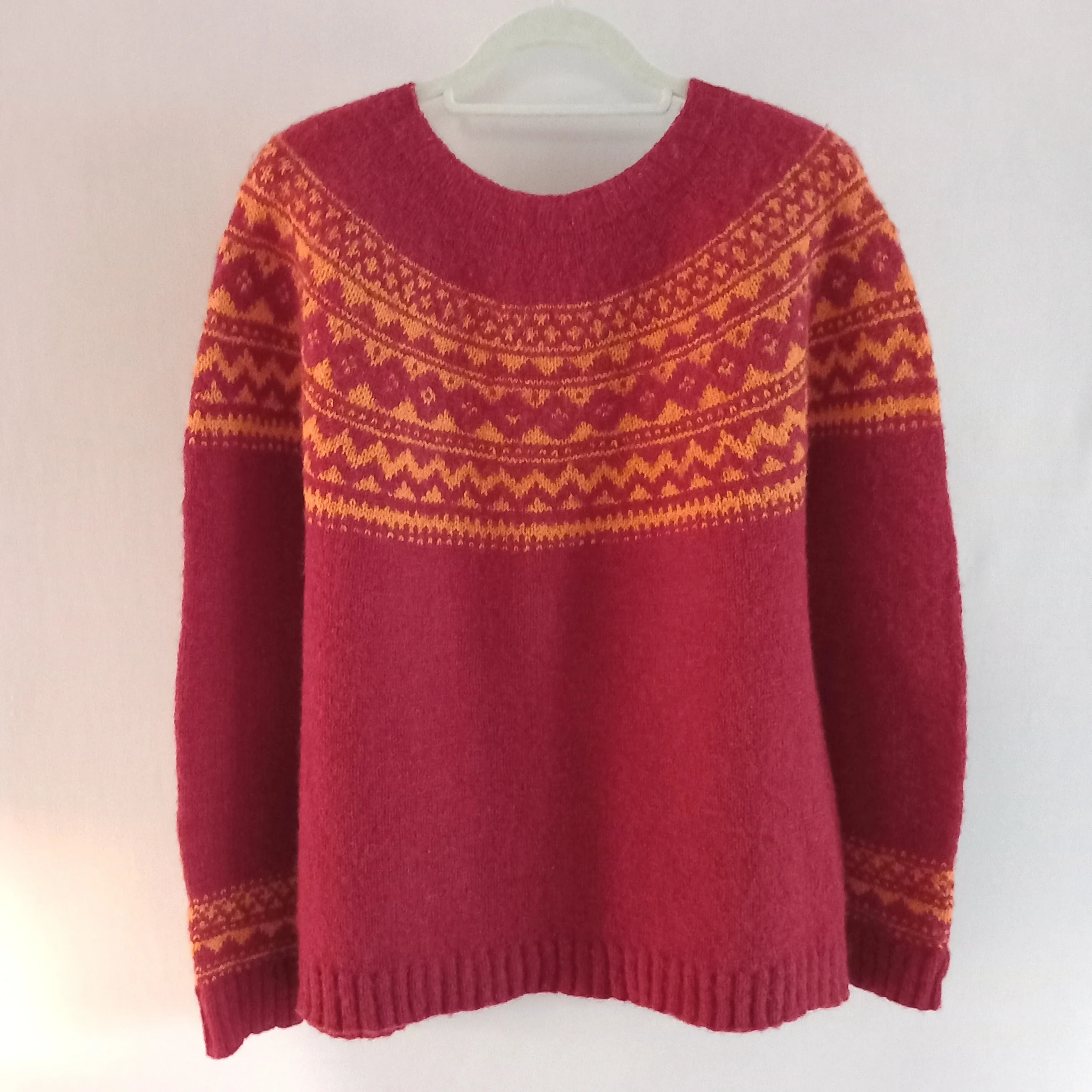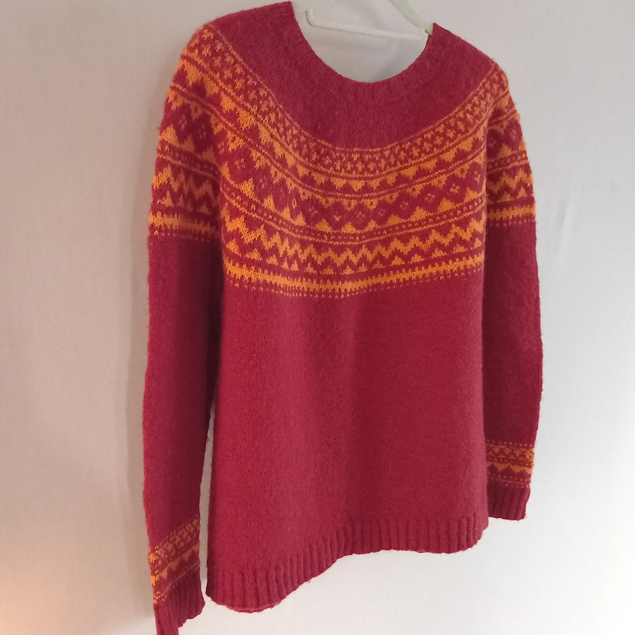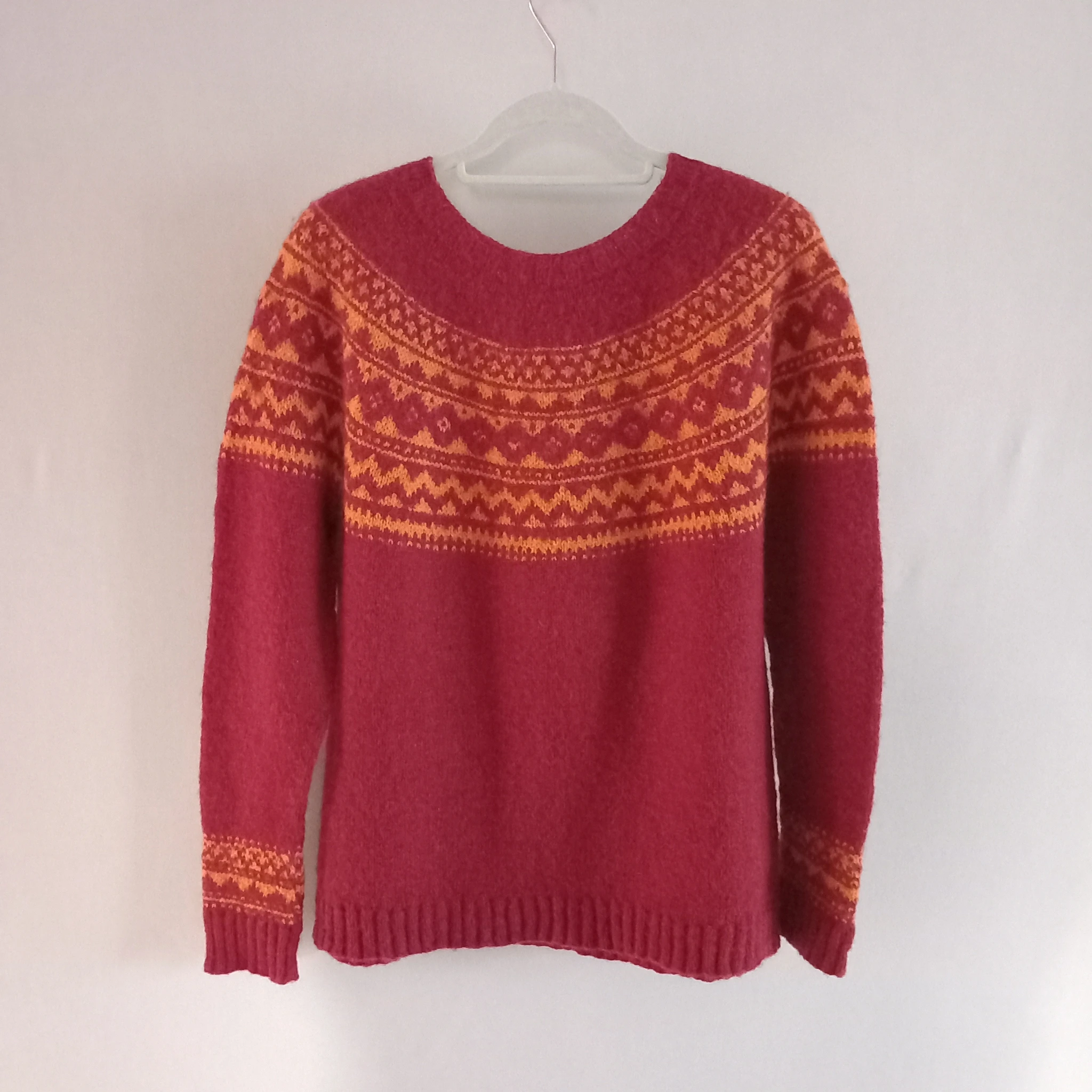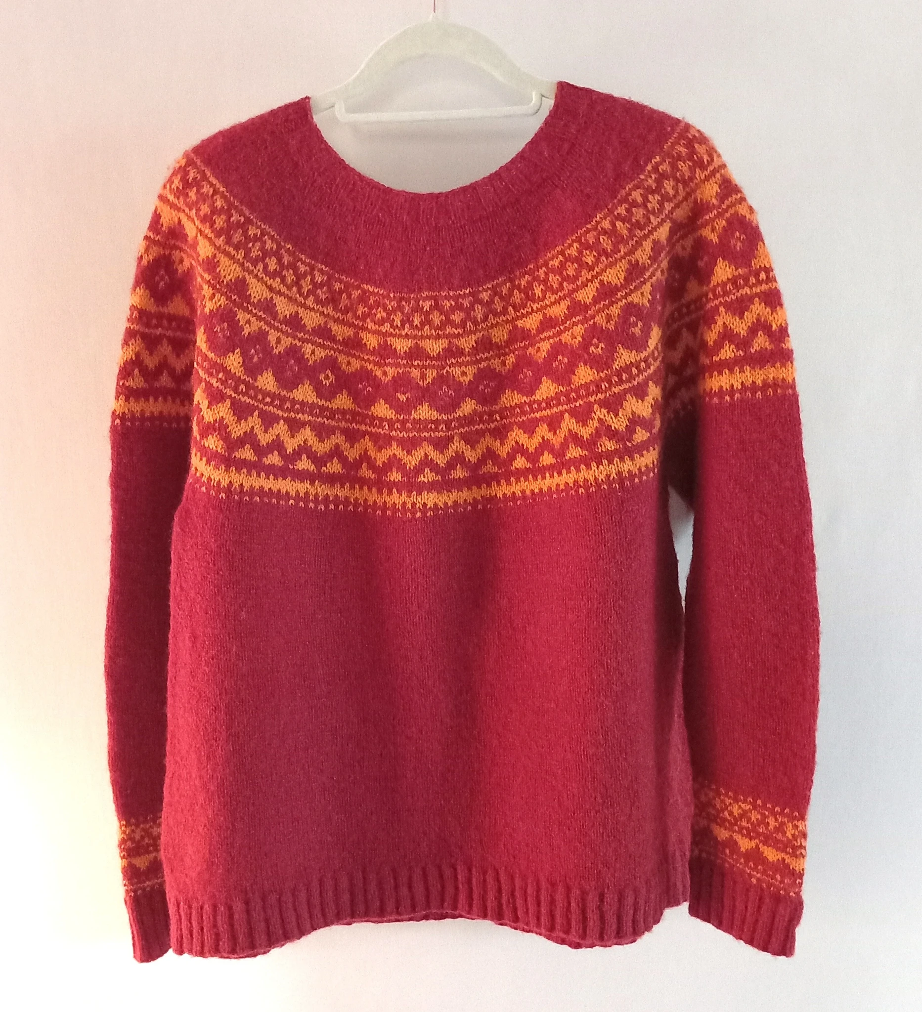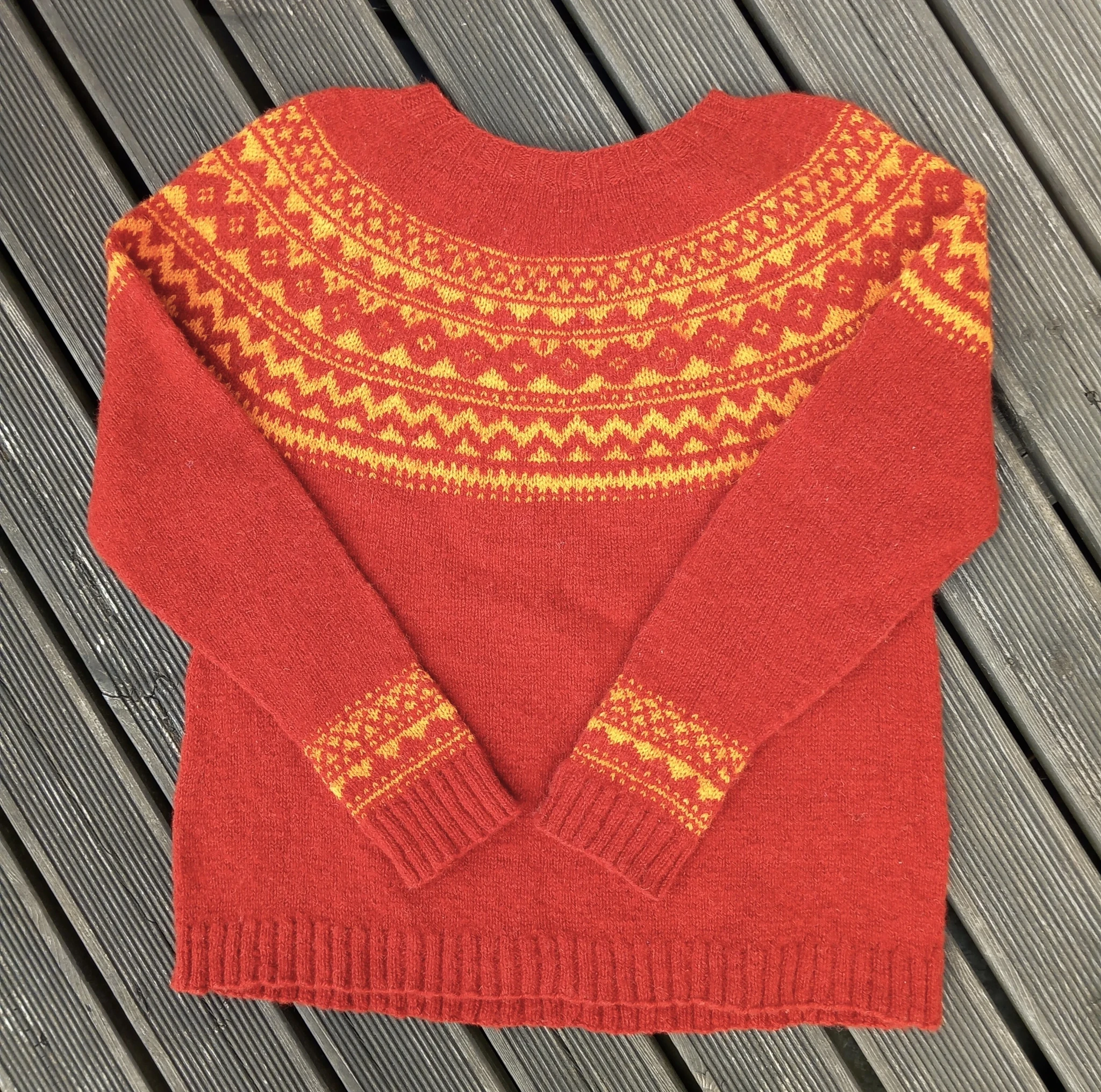 Tumepunasele kahekordsest lambavillasest lõngast käsitsi (varrastel) kootud kampsunile lisavad värvi põhjamaade stiilis ümar oranžikirju mustriline passe ning mustrilised randmeosad.