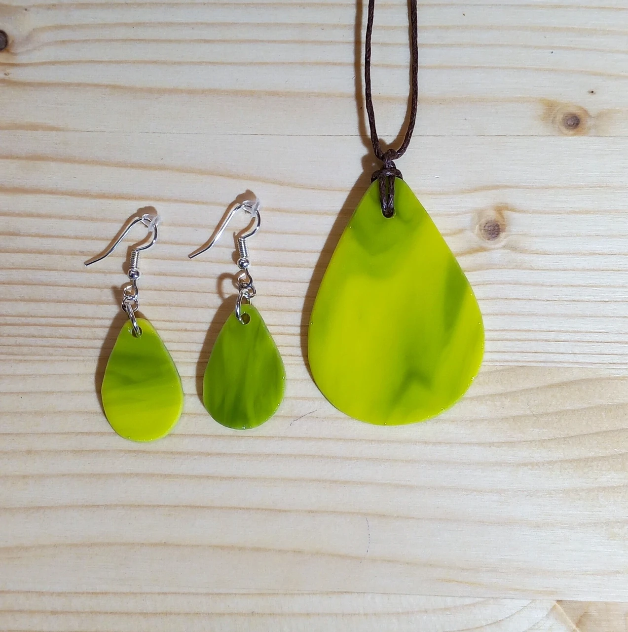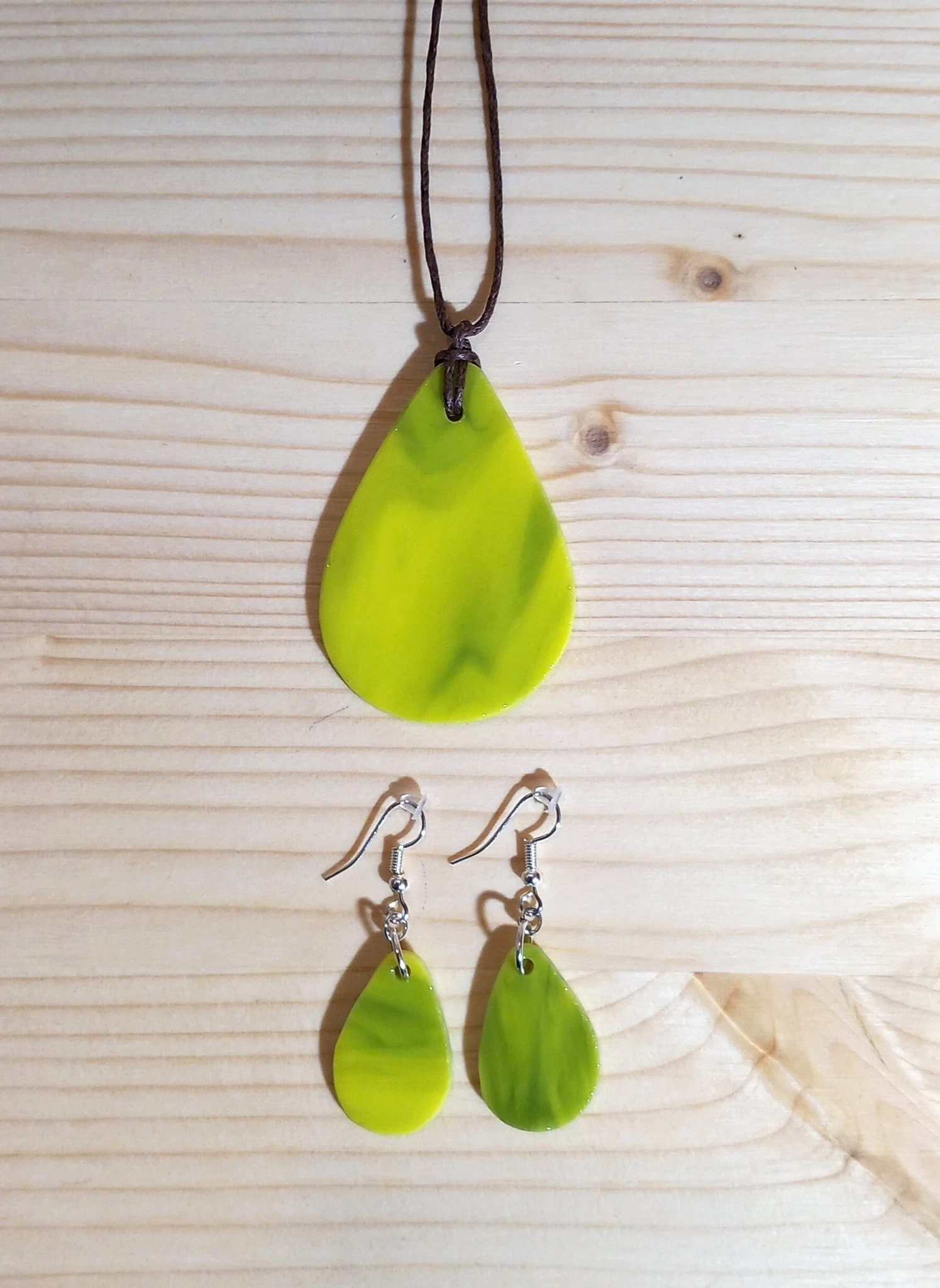 Rohekas-kollasest läbipaistmatust klaasist ehtekomplektis on tilgakujuline kaelaehe koos kõrvarõngastega.