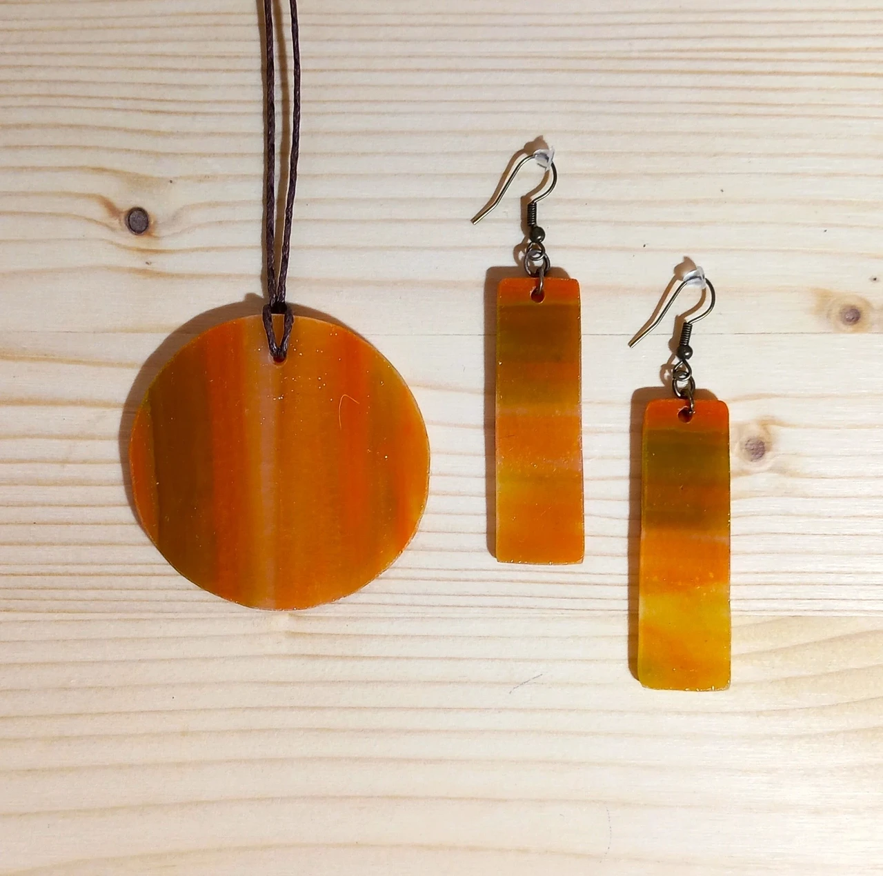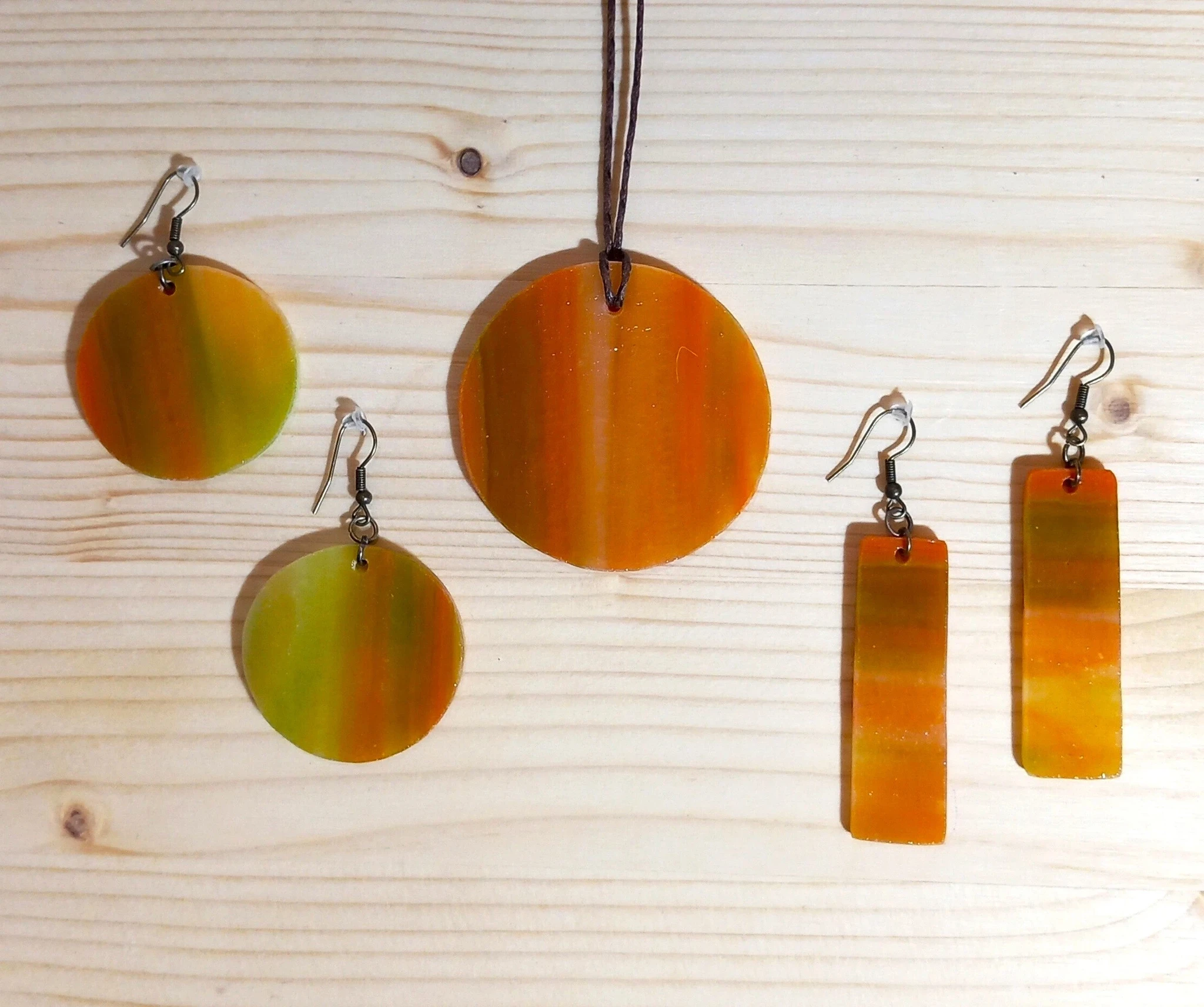 Komplektis on oranži- ja rohelisekirjust läbipaistmatust klaasist valmistatud kaelaehe ning ümmargused või ristkülikukujulised (valikuliselt 1 paar) kõrvarõngad.