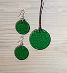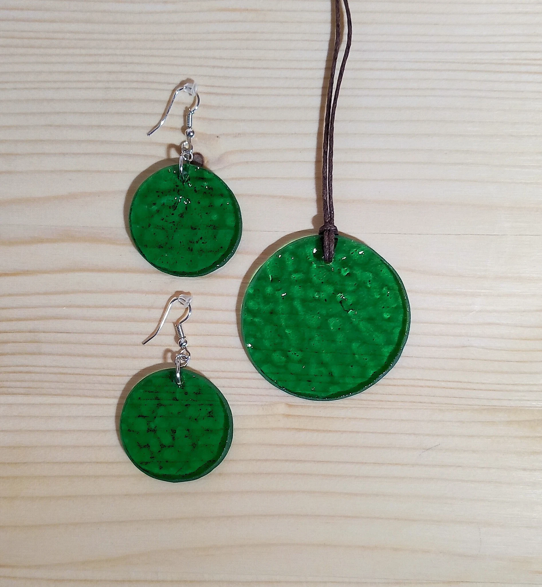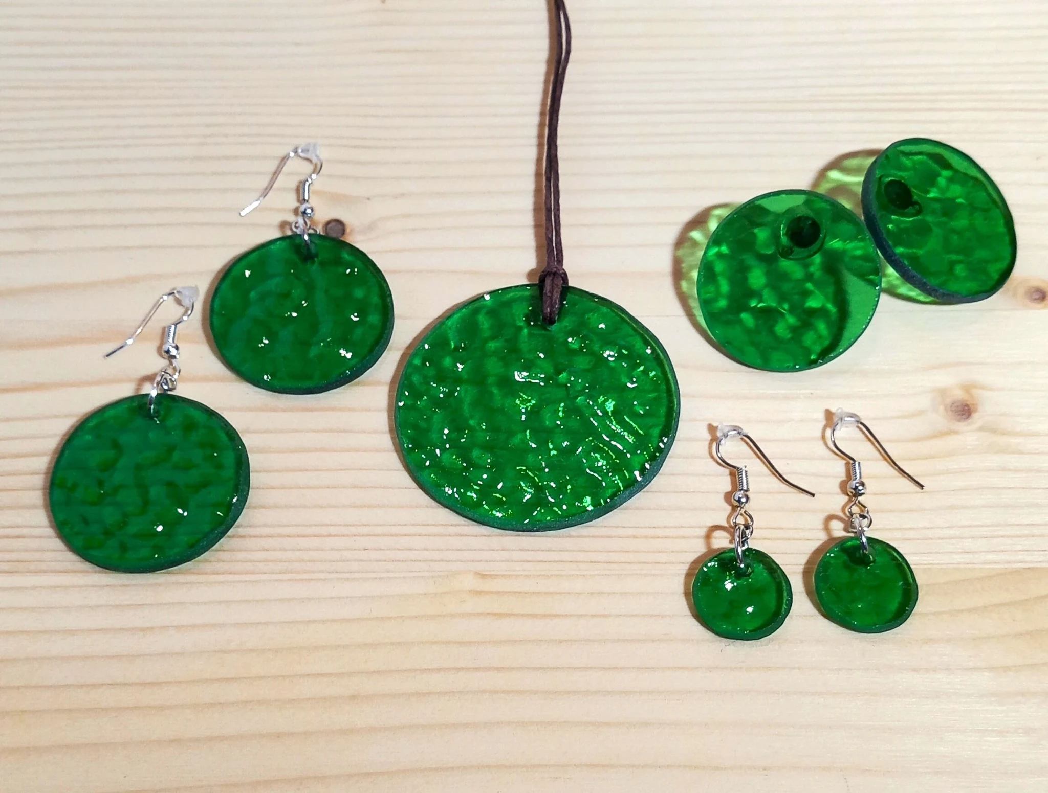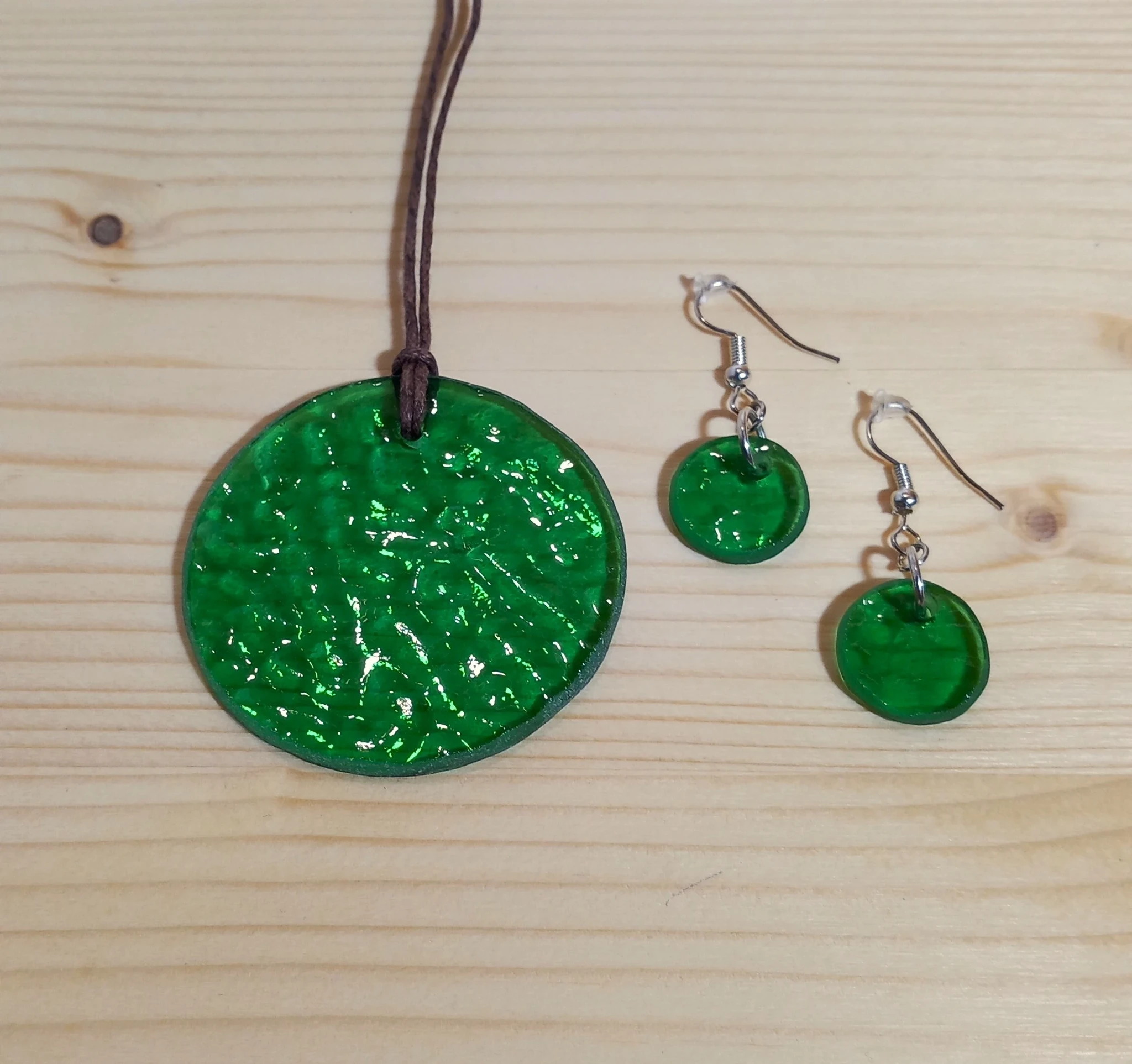 Rohelisest läbipaistvast, kergelt tekstuursest klaasist ehtekomplekti kuulub kaelaehe ning valikuliselt üks paar kõrvarõngaid.