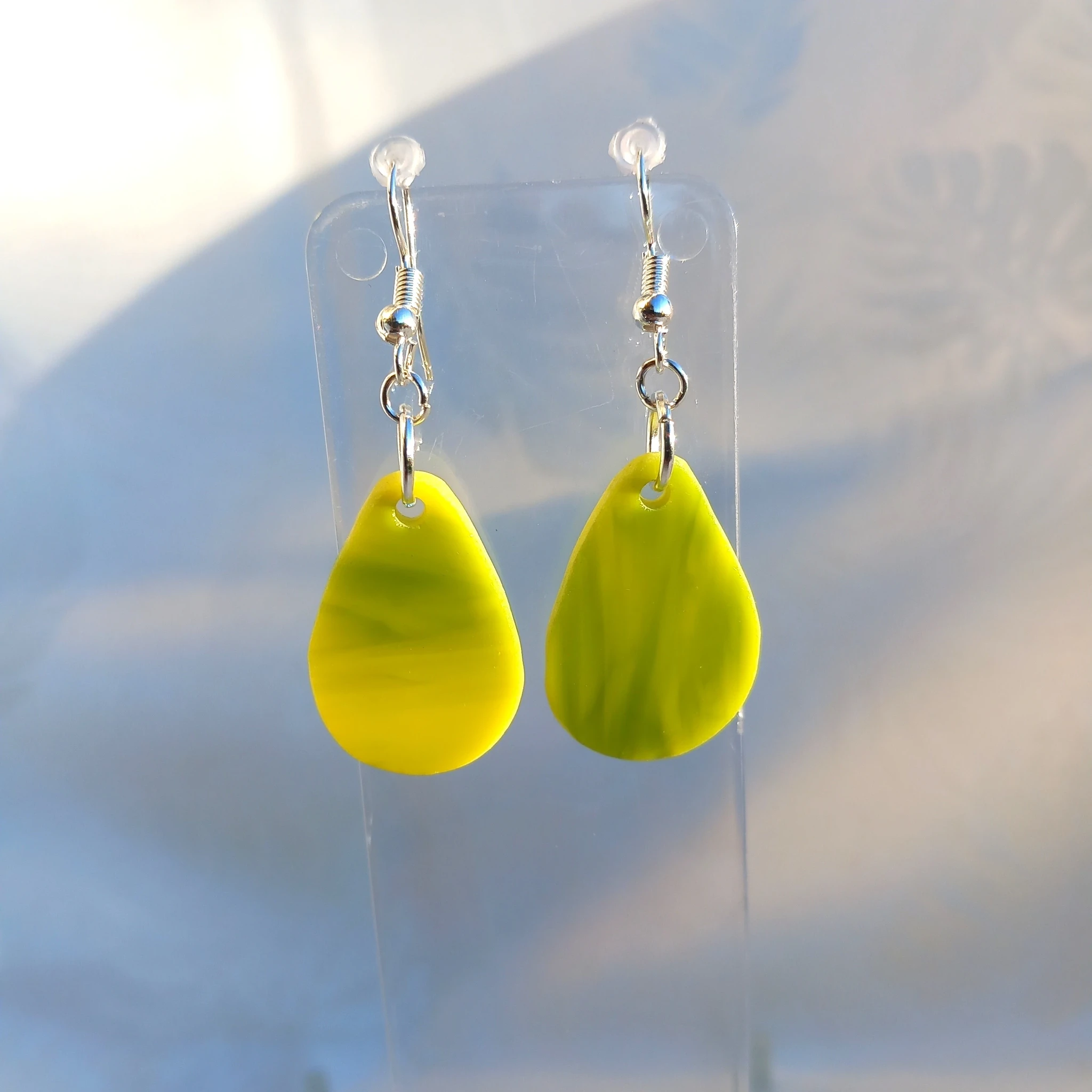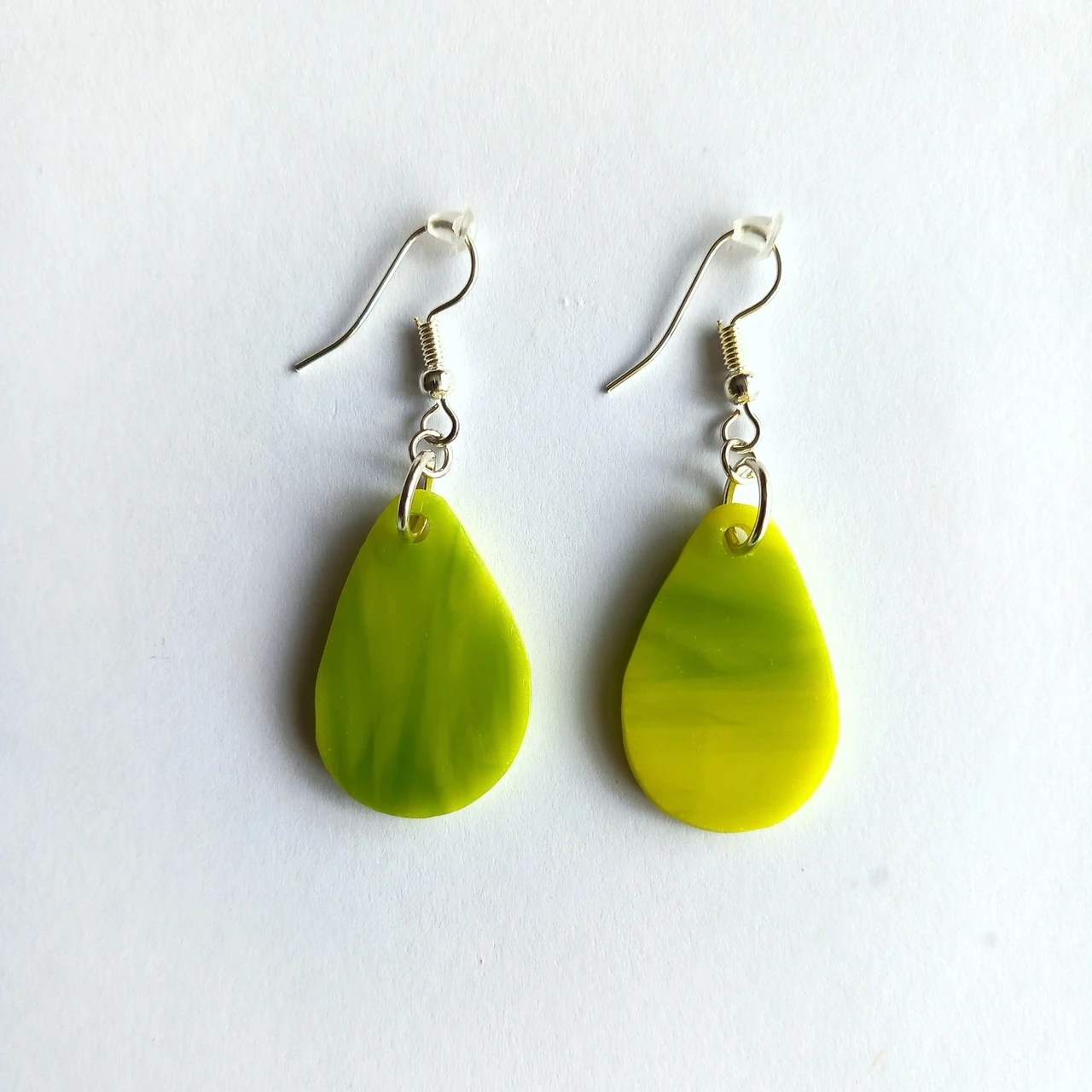 Rohekas-kollasest läbipaistmatust klaasist tilgakujulised kõrvarõngad hõbedaste kõrvarõngakonksudega.