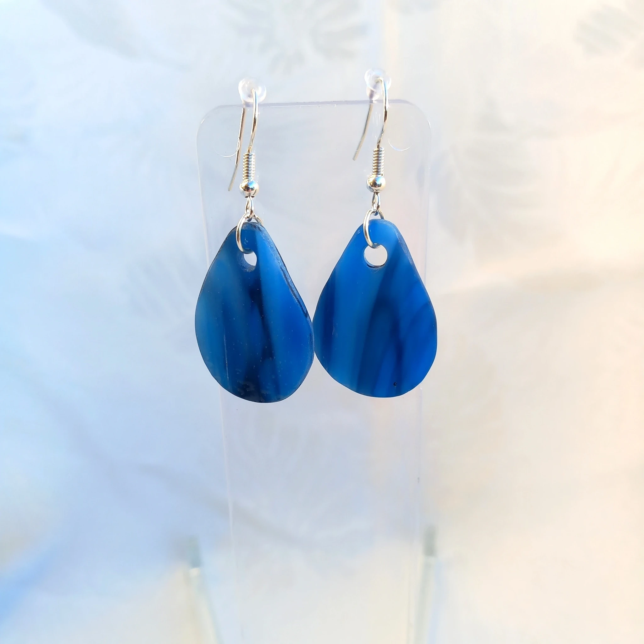 Sinisest läbipaistmatust klaasist tilgakujulised kõrvarõngad hõbedaste kõrvarõngakonksudega.