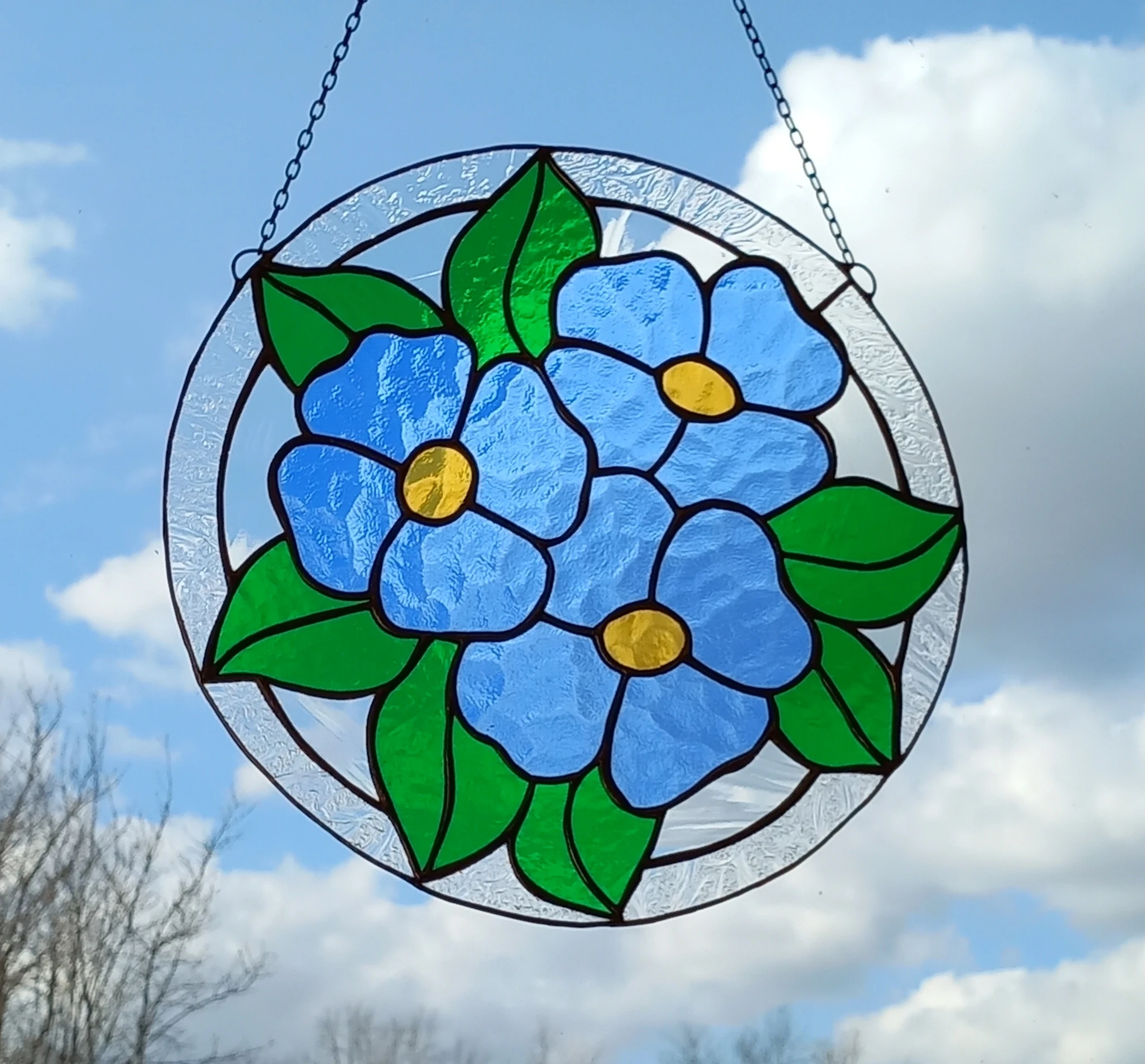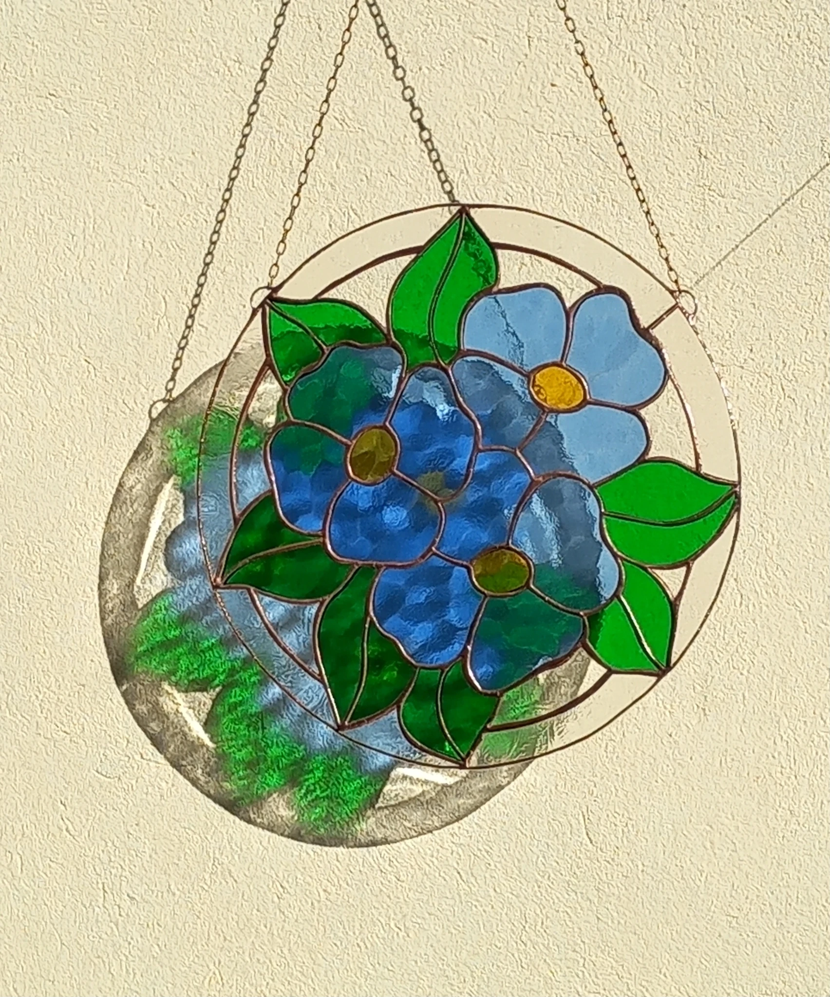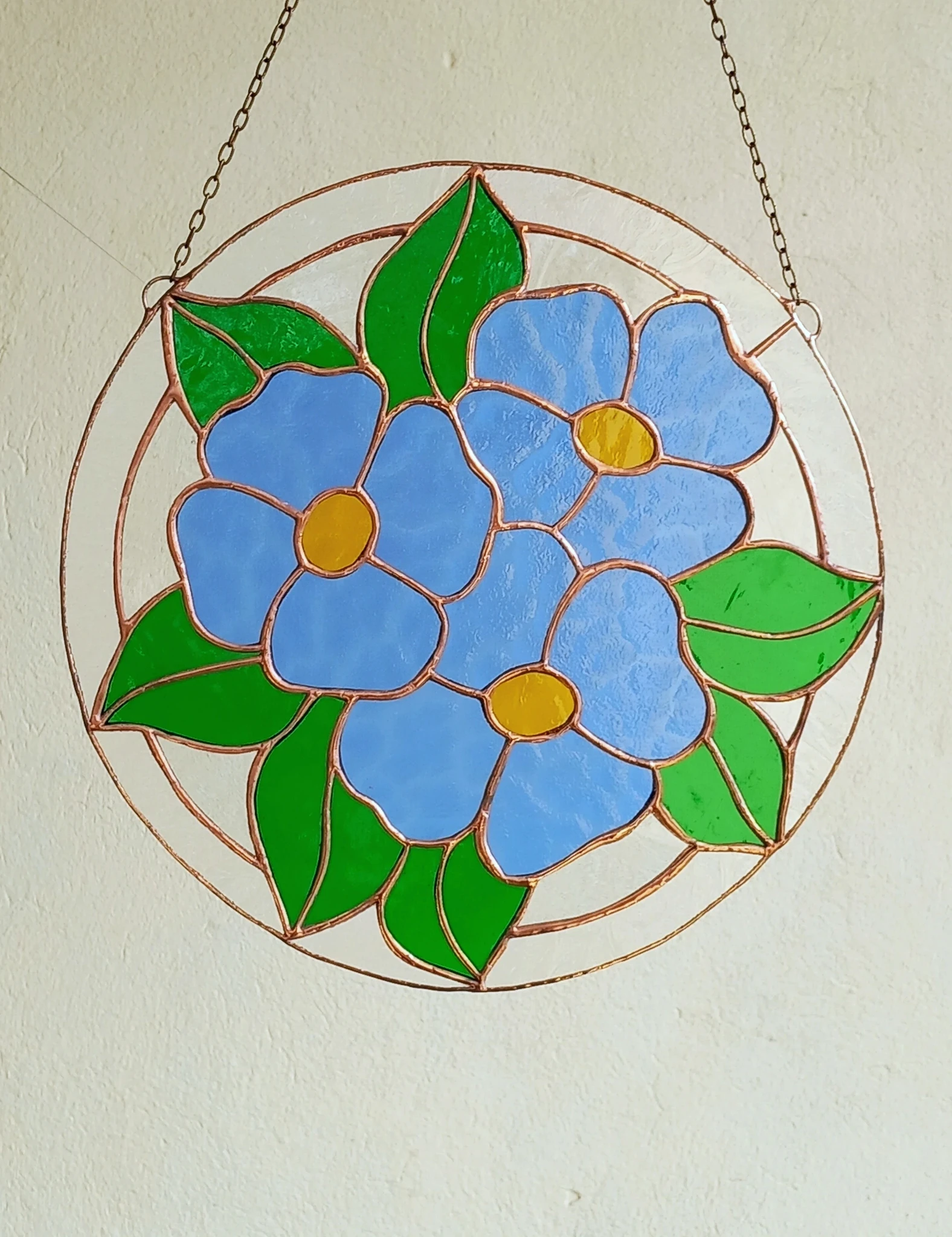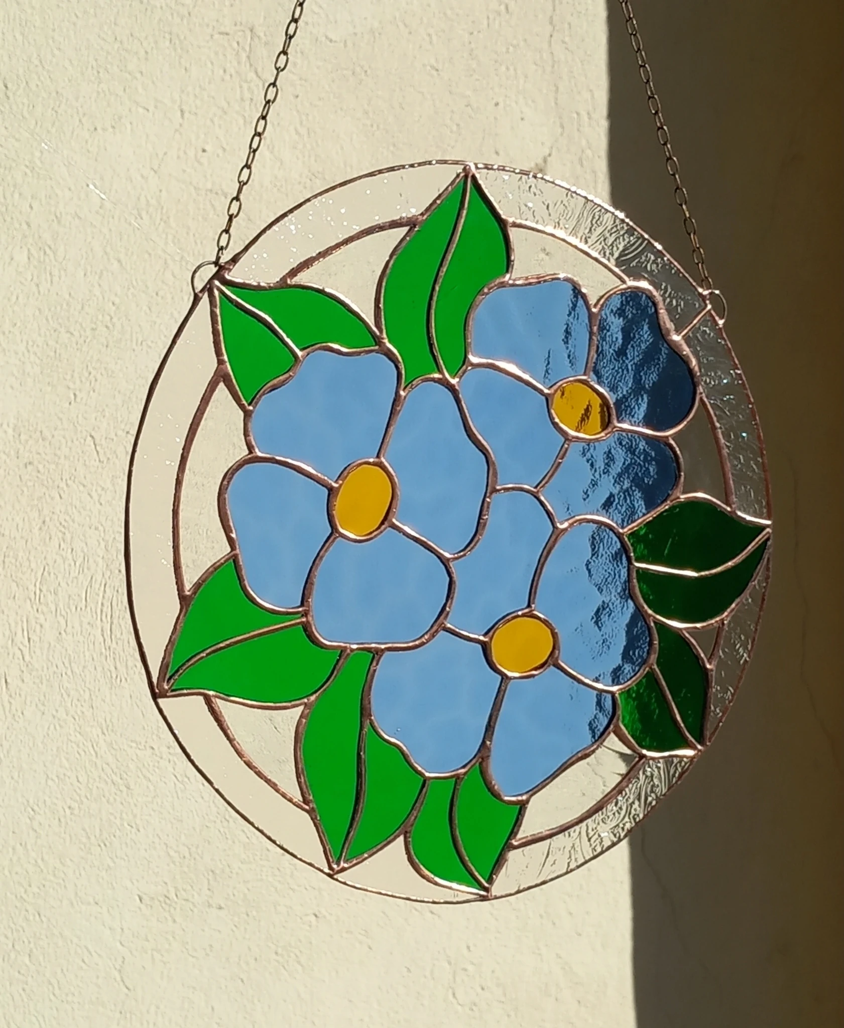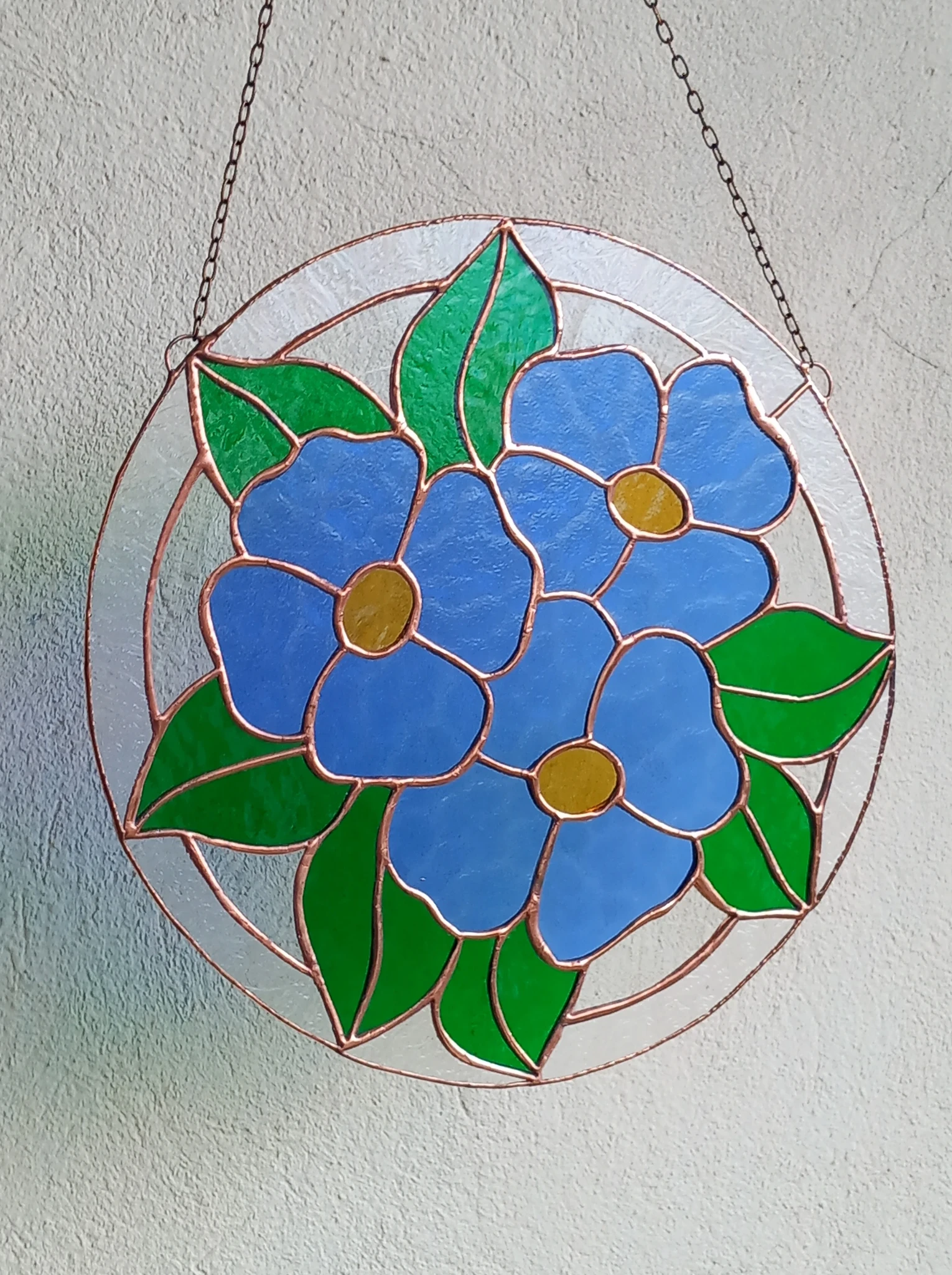 Materjal: värviline klaas, jootetina, vaskpaatina, kaasas riputuskett