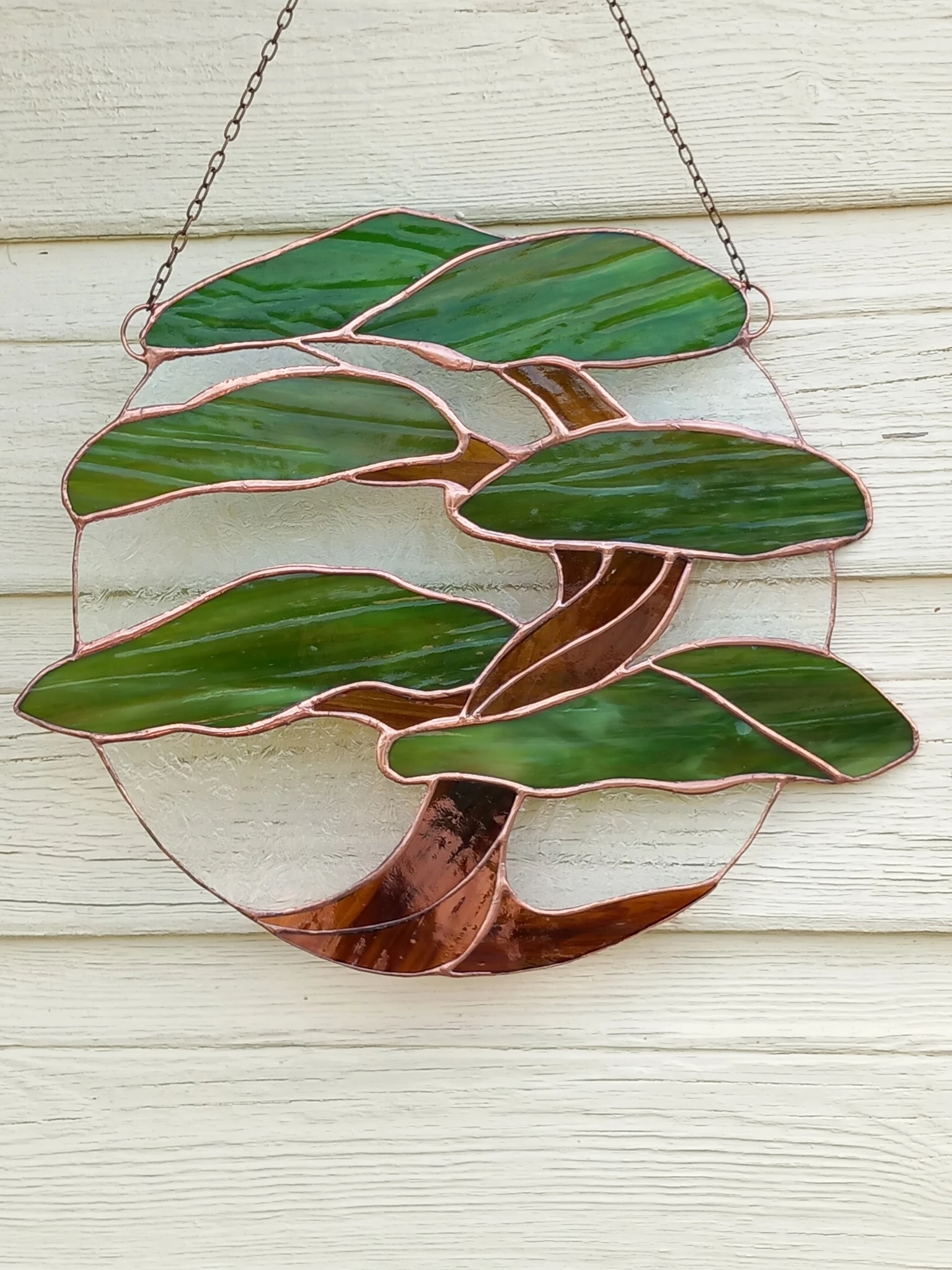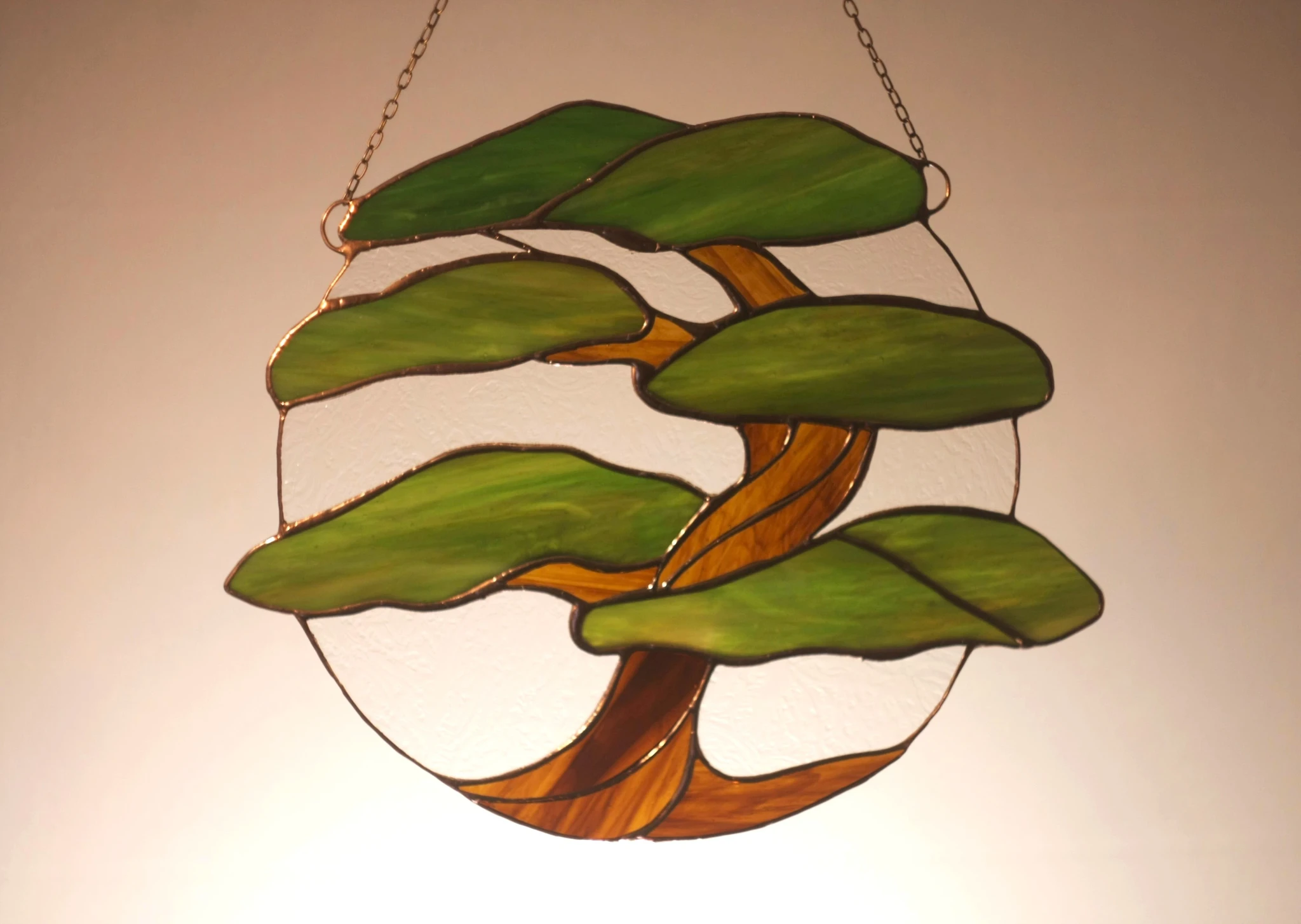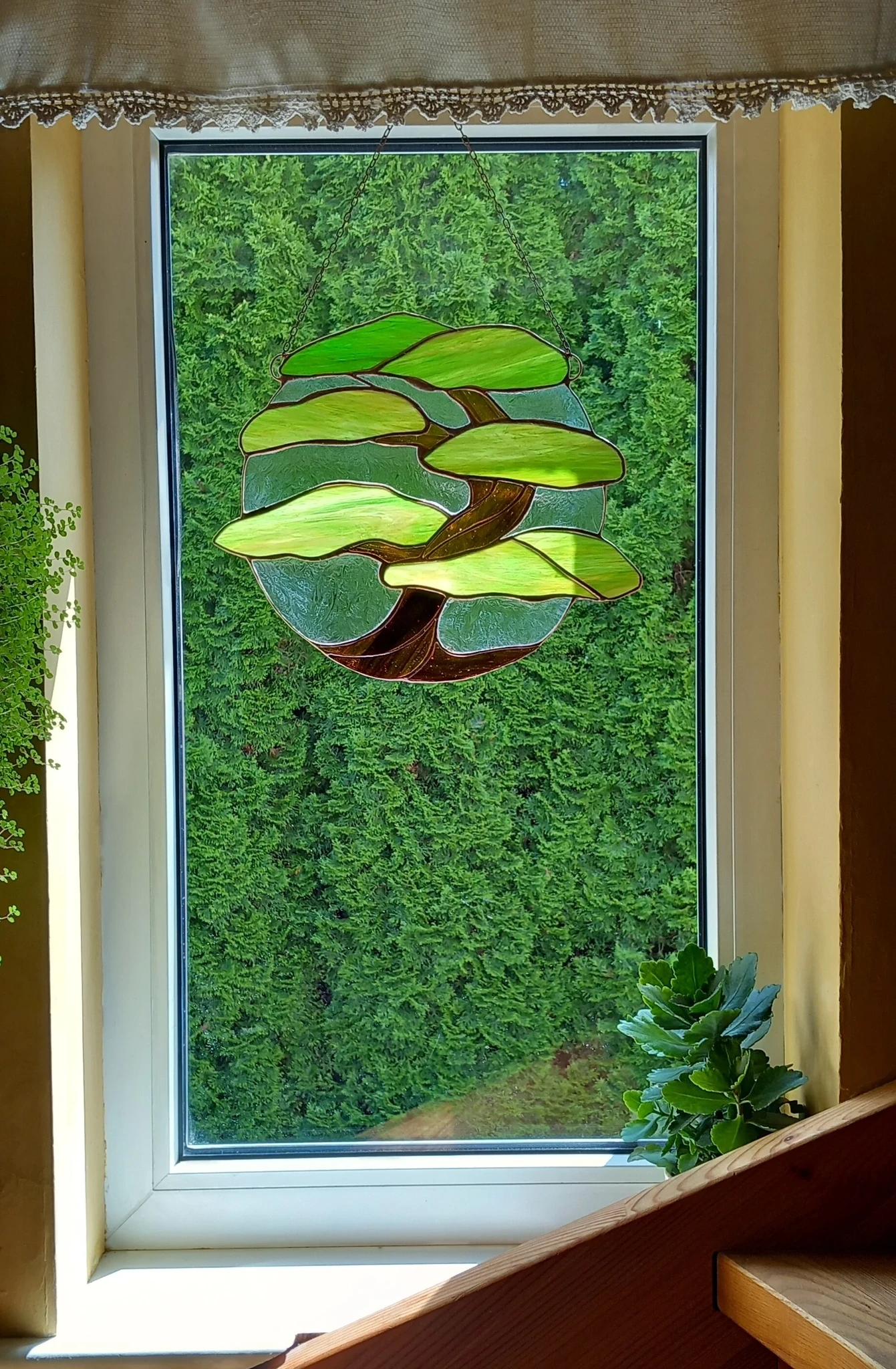 Materjal: värviline klaas, jootetina, vaskpaatina, kaasas riputuskett