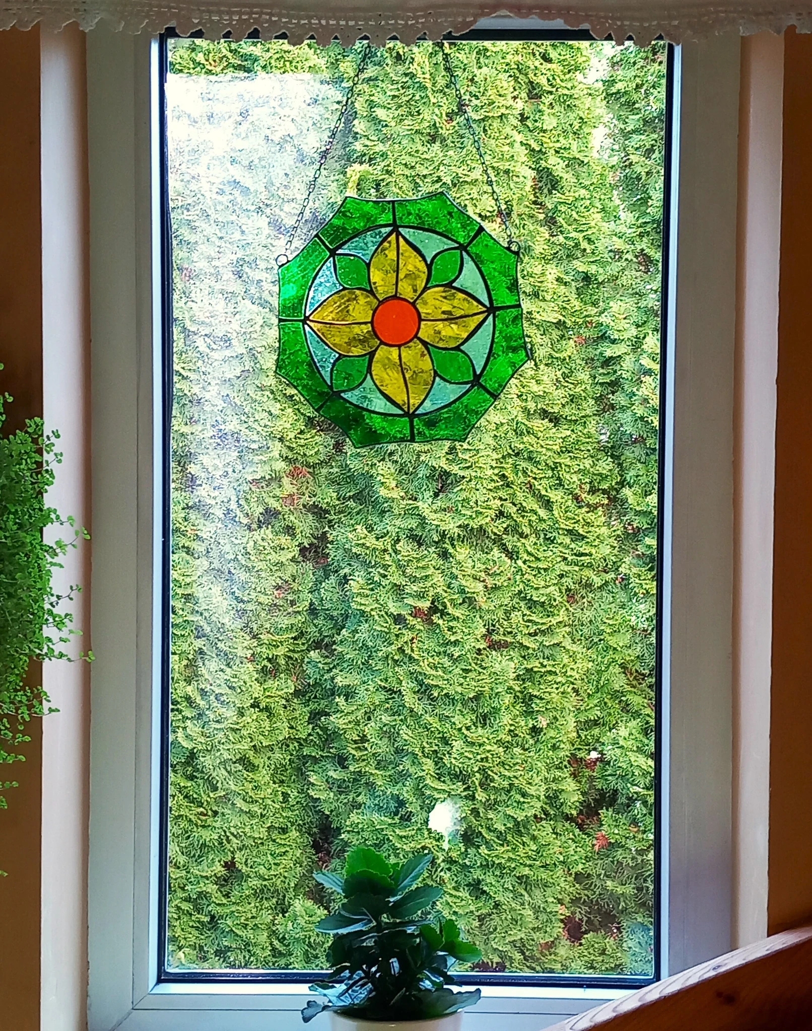 Materjal: värviline klaas, jootetina, must paatina, kaasas riputuskett