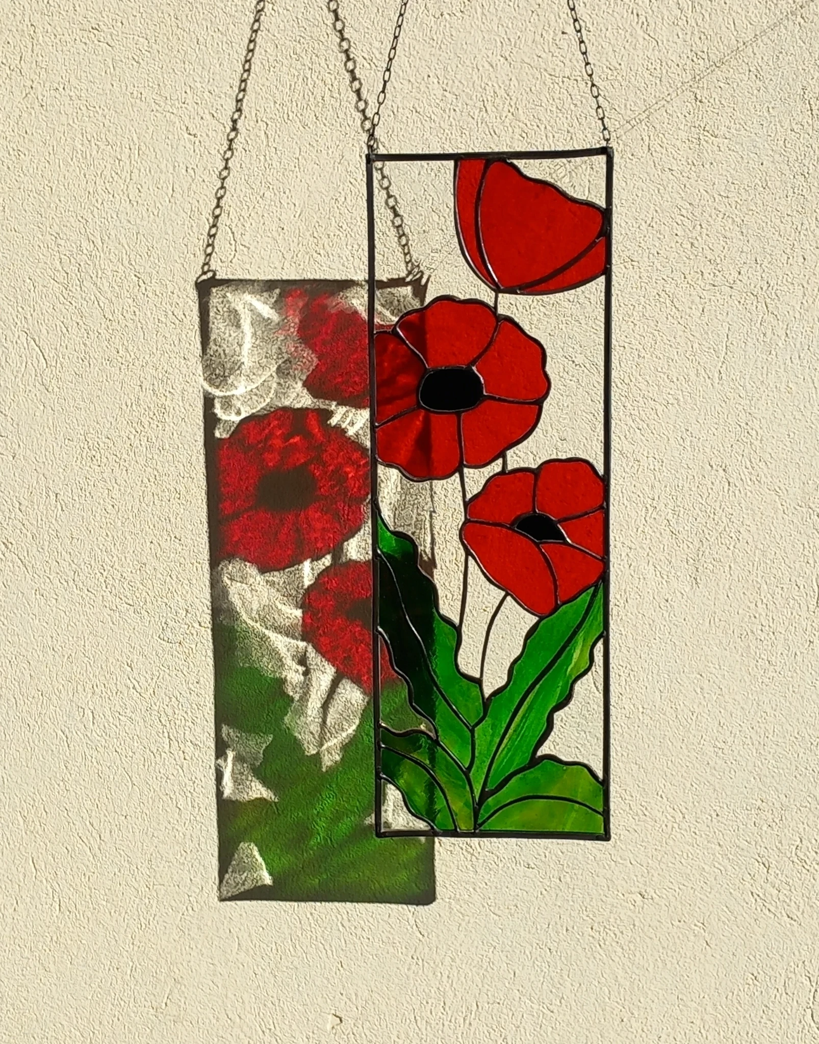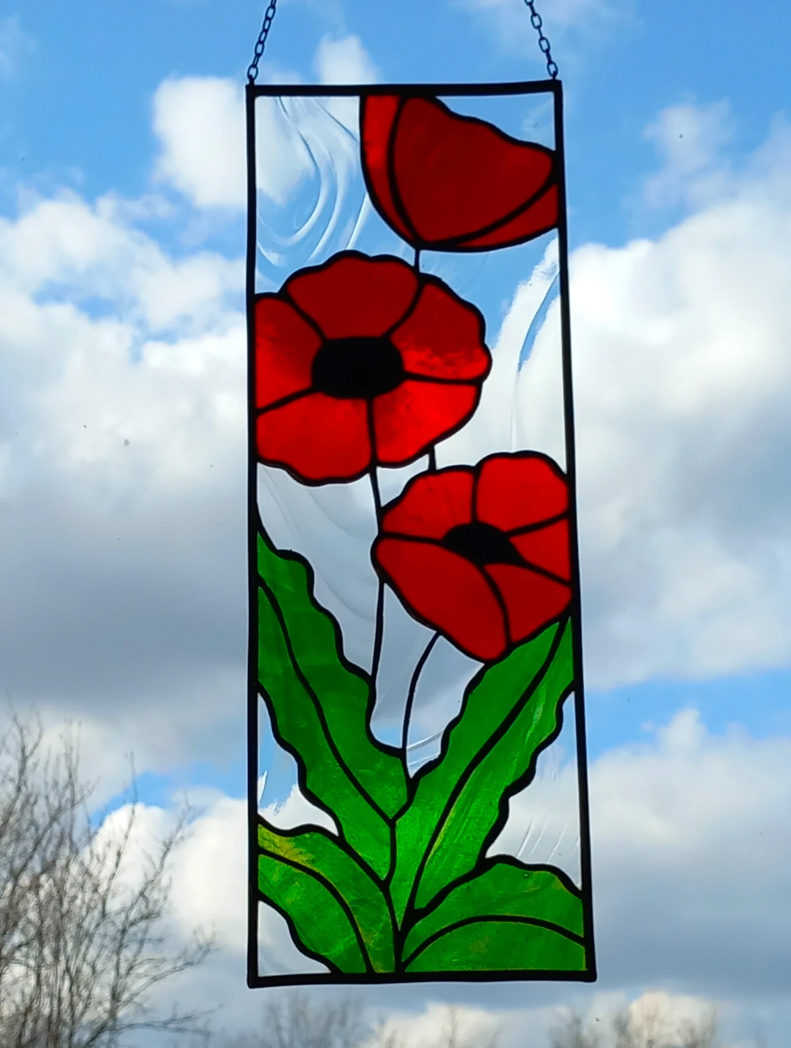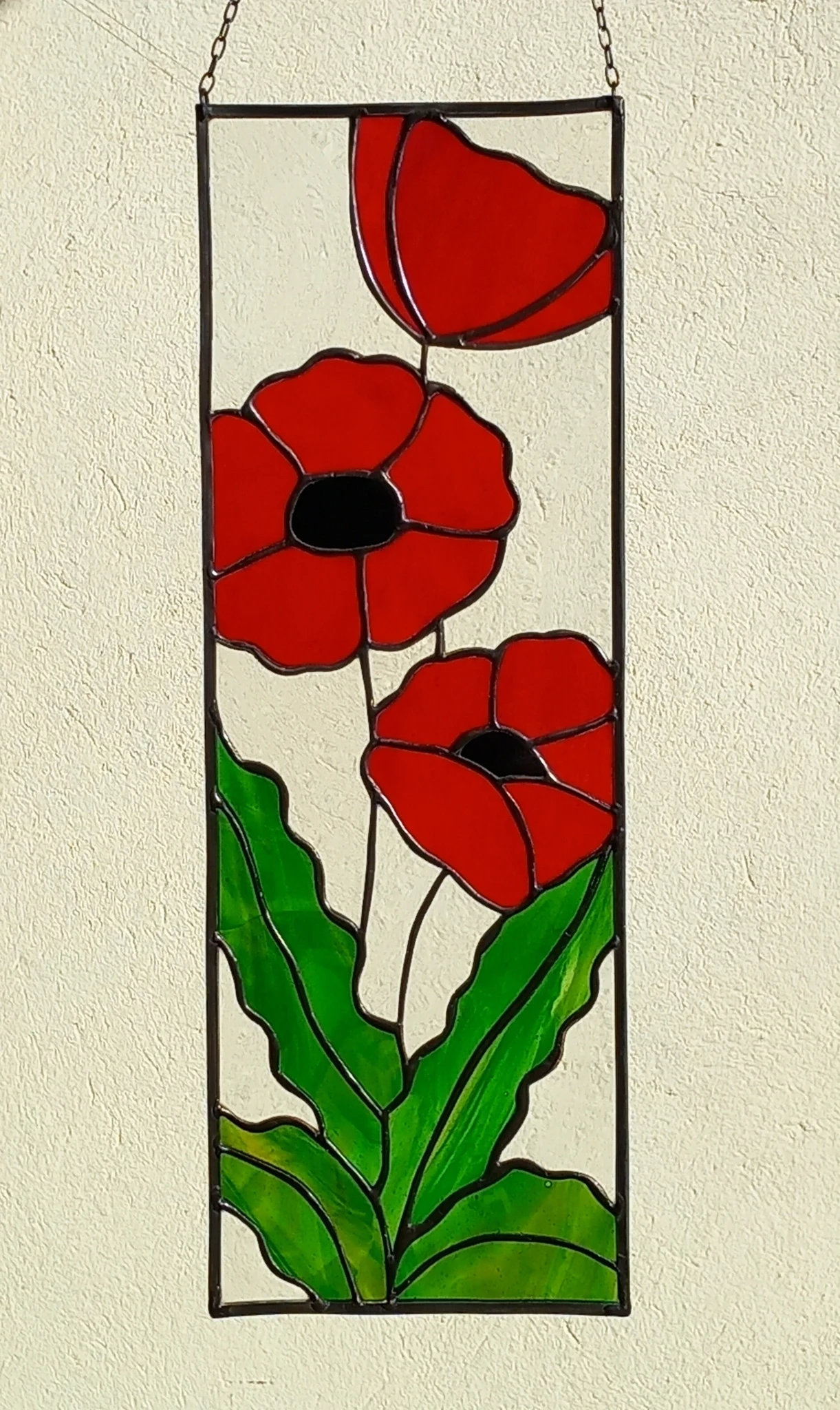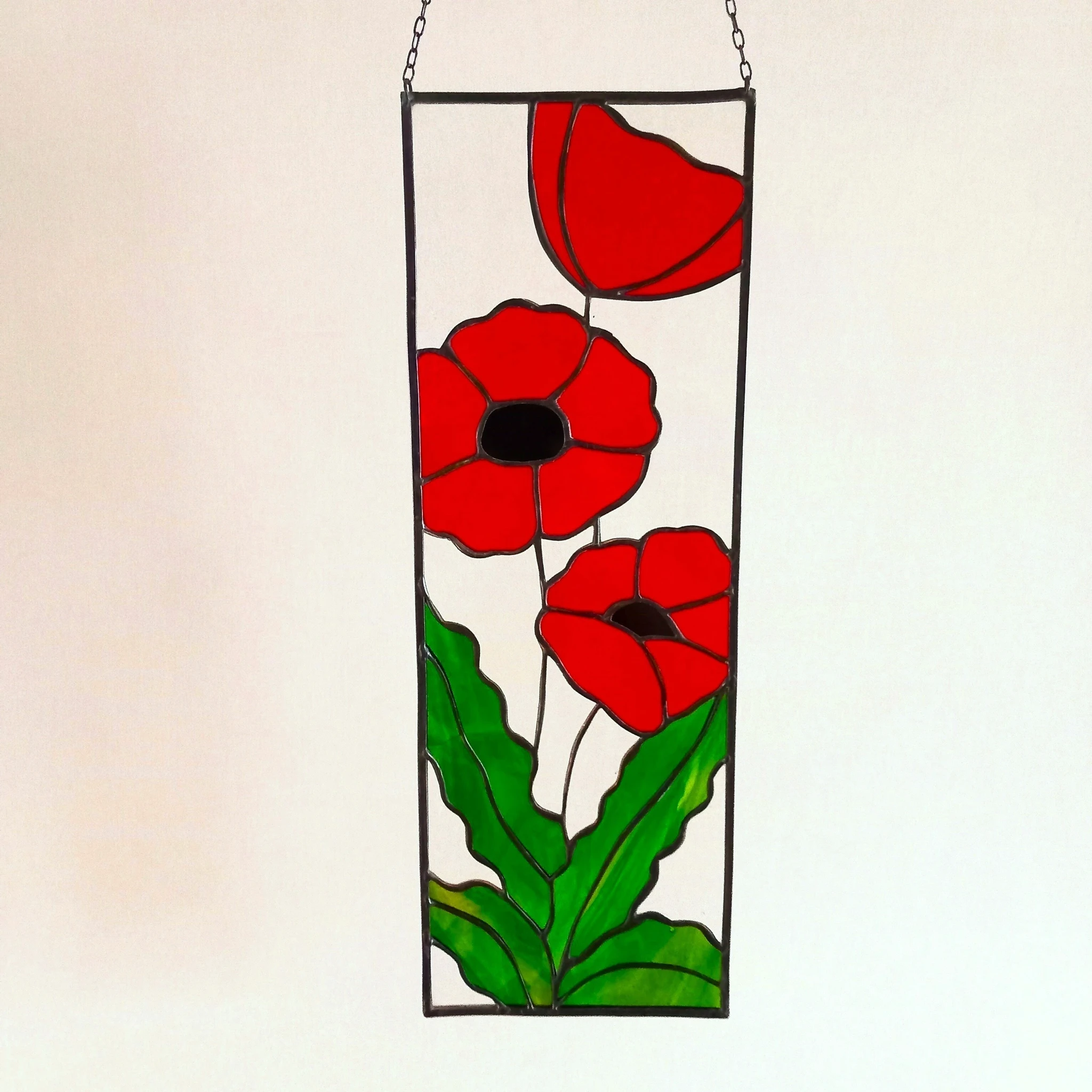 Materjal: värviline klaas, jootetina, tinaprofiil, must paatina, kaasas riputuskett.