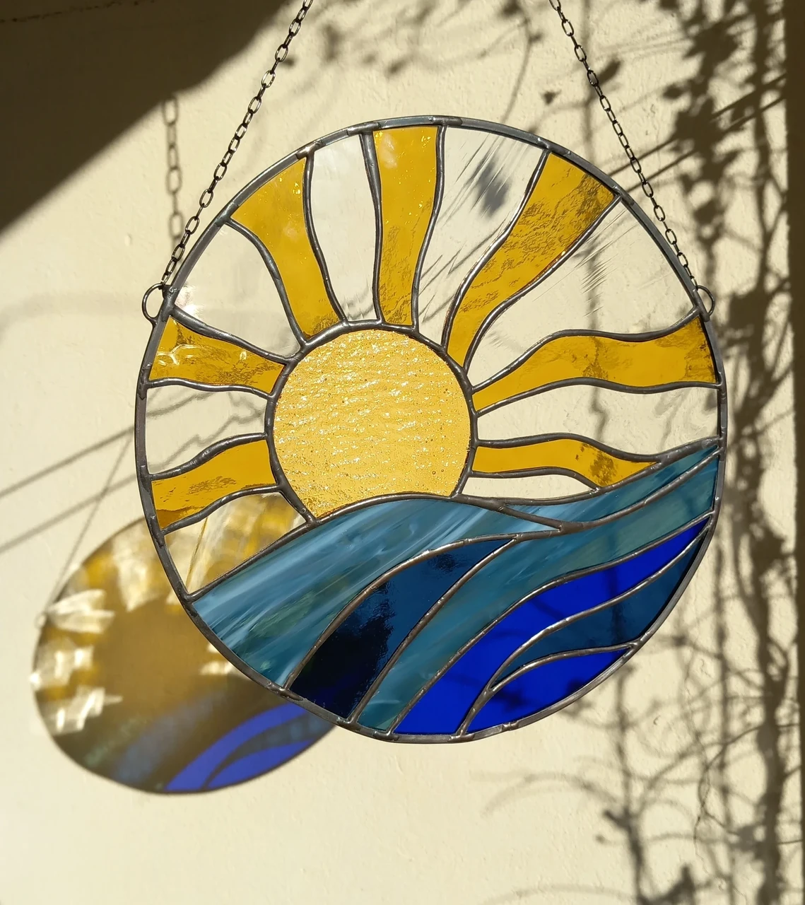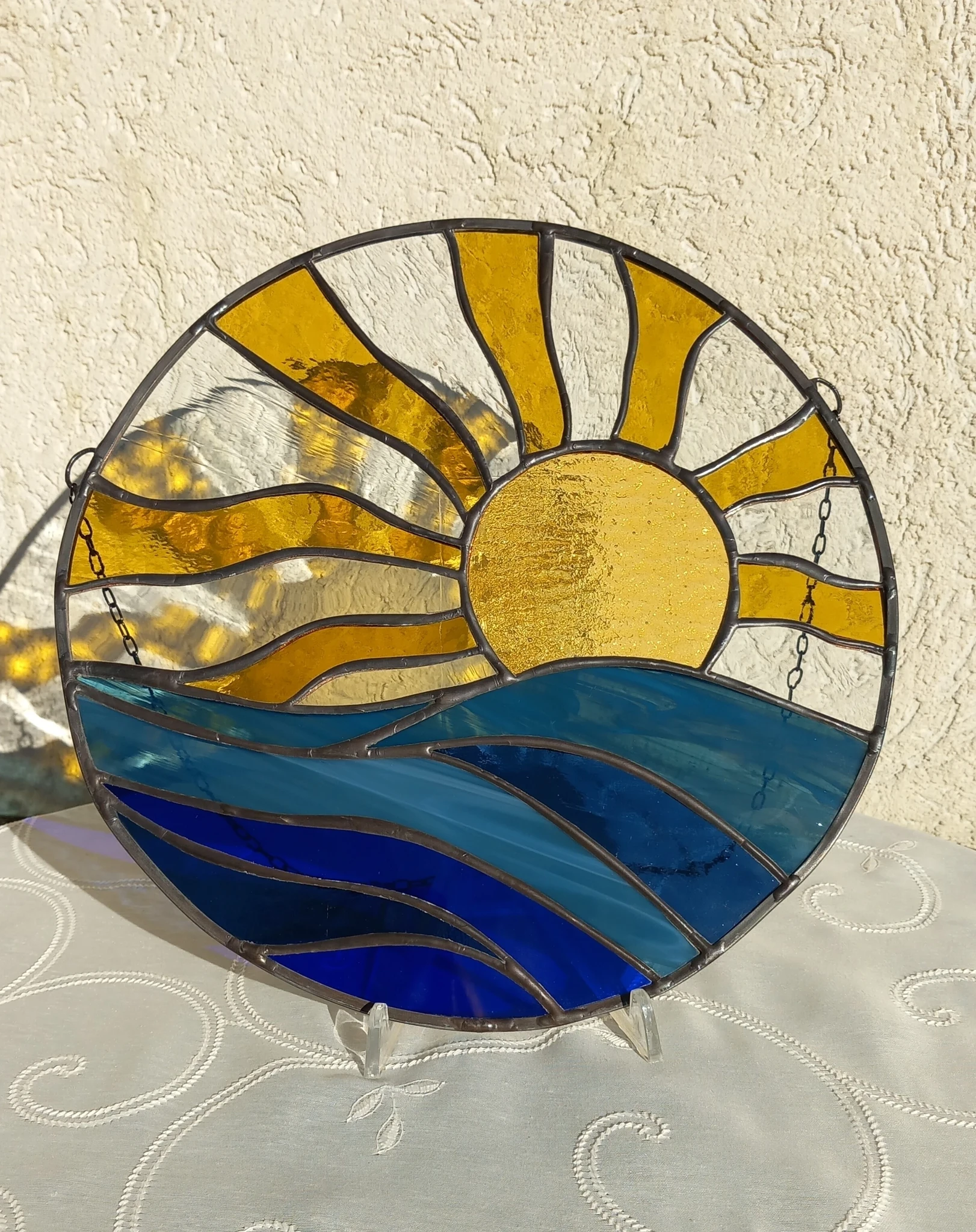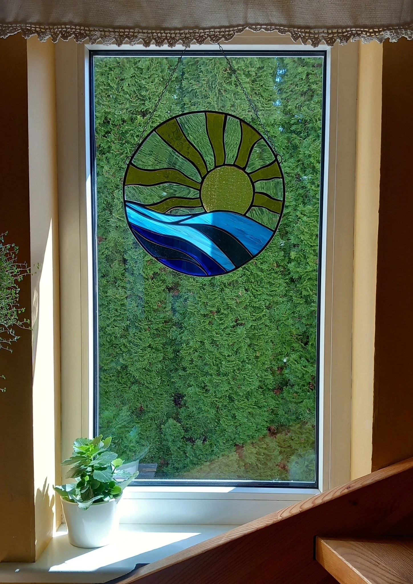 Materjal: värviline klaas, jootetina, tinaprofiil, must paatina, kaasas riputuskett