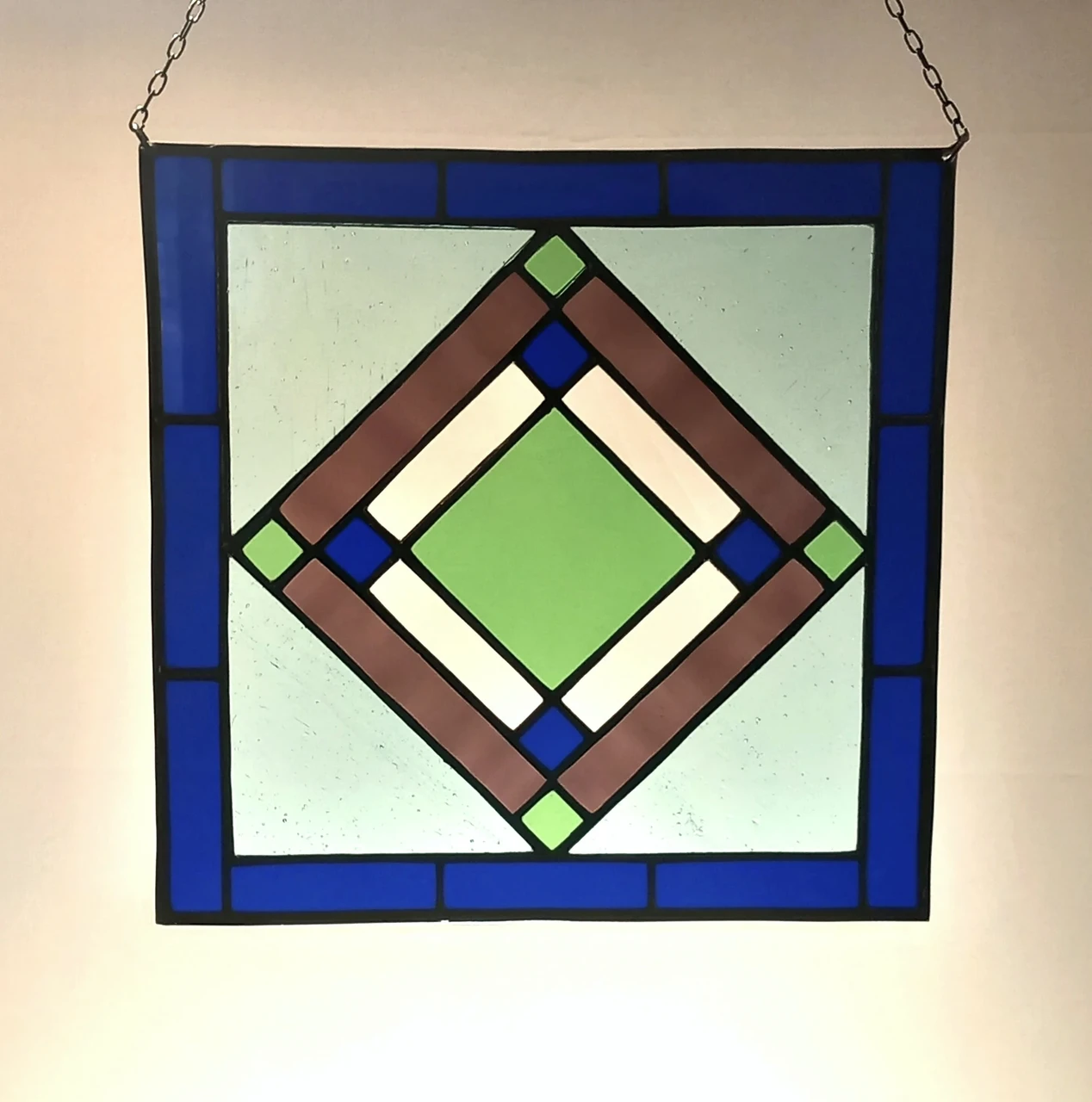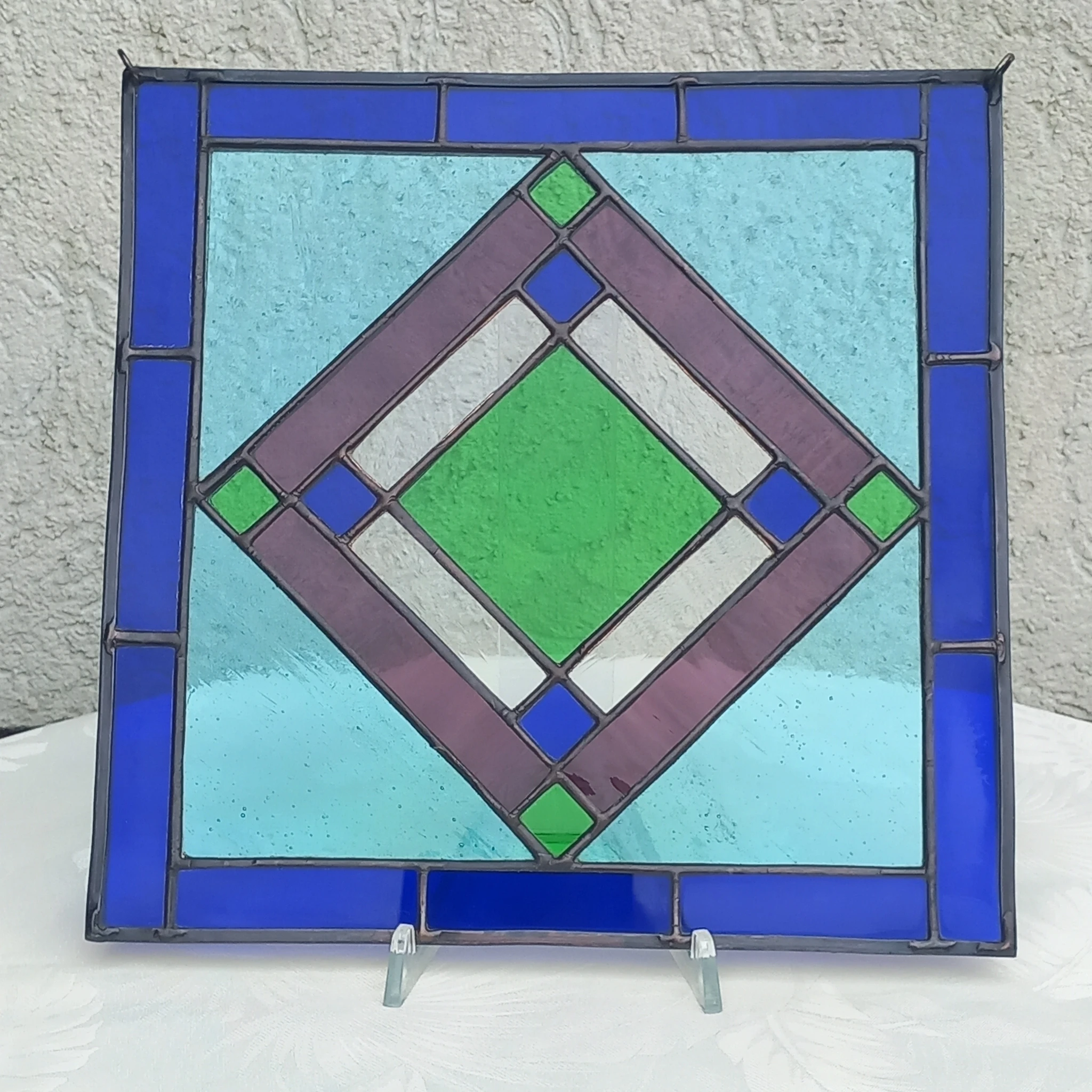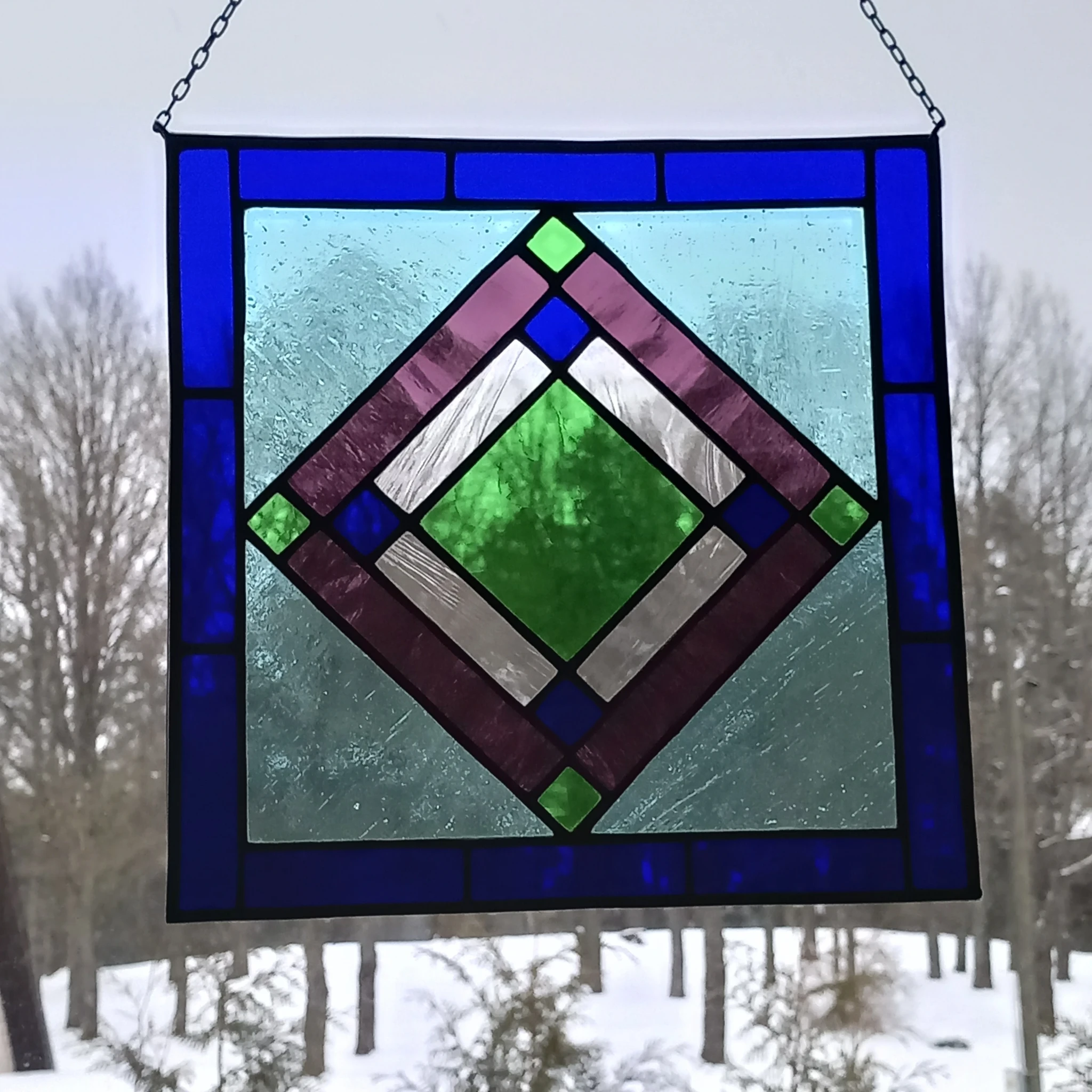 Geomeetriline, selgete-sirgete joontega sinise-rohelise-lillades toonides vitraaž.
